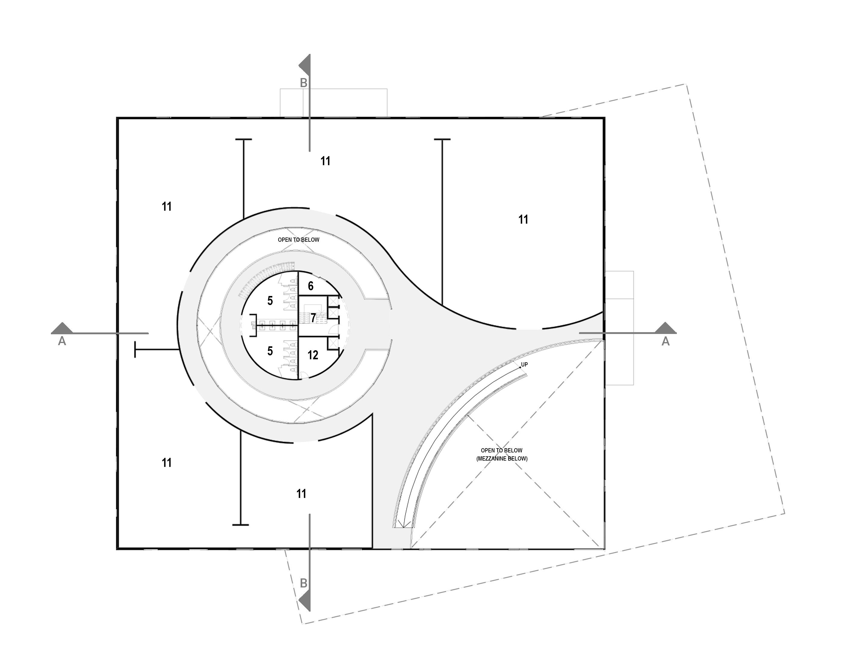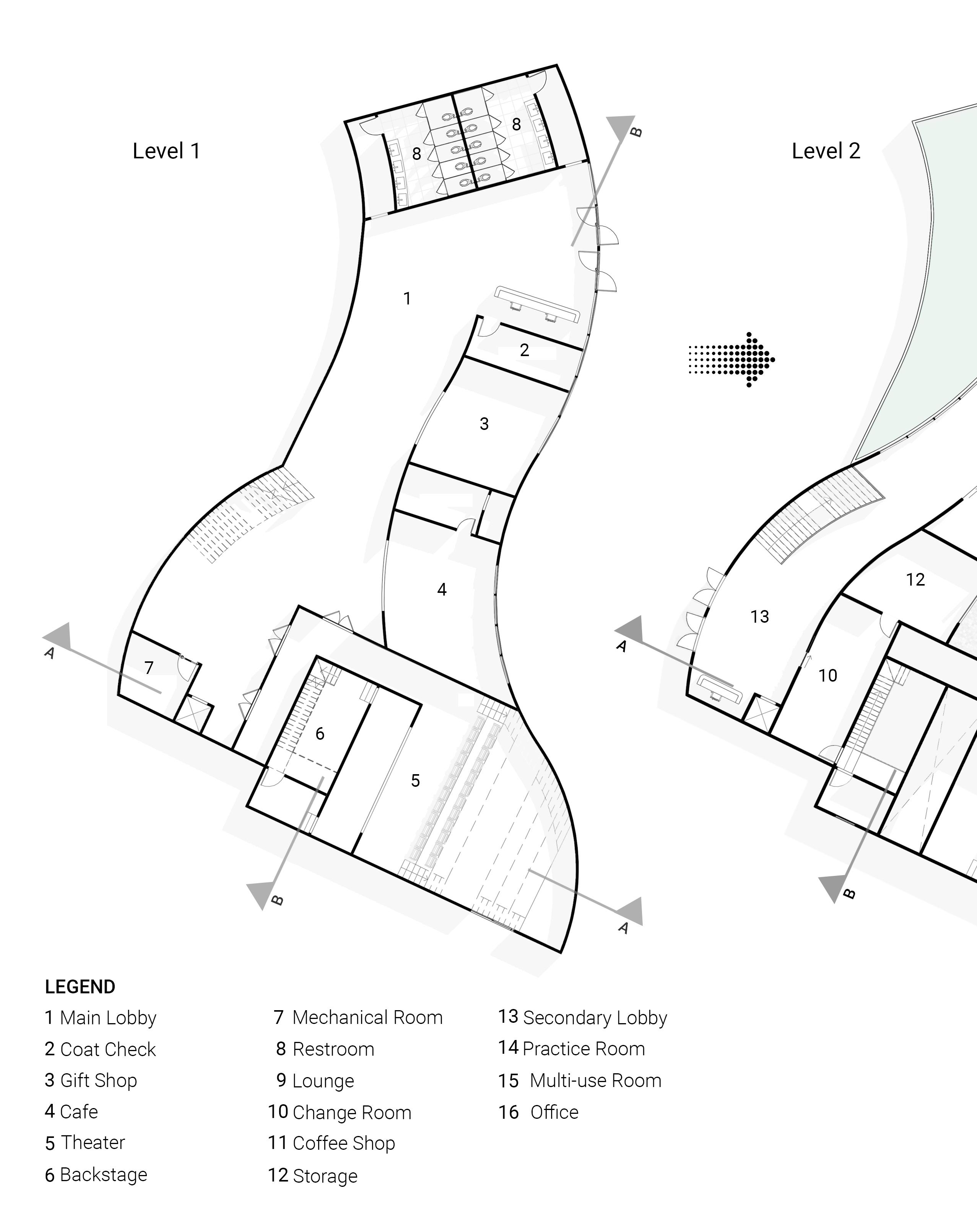 1. Receiving 2. Gift Shop 3. Cafe 4. Workshop Rooms 5. Restrooms 6. Storage Rooms 7. Stair Shaft 8. Mechanical Room 9. Main Lobby 10. Gathering Area 11. Painting Galleries 12. Multi-use Rooms 13. Administration 14. Auditorium 15. After Hours Lobby 16. Deck 17. Sculpture Galleries 18. Tech Room 19. Learning Center 20. Cultural Center