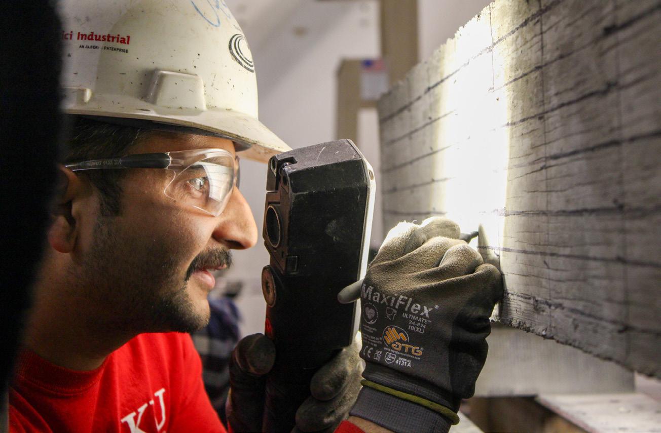Top left: Josie Taylor examines dirty water undergoing coagulationflocculation. Top right: Dave Darwin testing a specimen in the lab a few years ago. Middle: the 2023 KU Concrete Canoe Team;. Bottom left: Caroline Bennett and William Collins receive an award; Bottom right: The LEEP Building