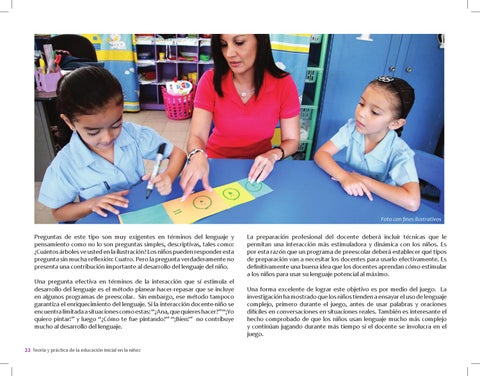 La preparación profesional del docente deberá incluir técnicas que le permitan una interacción más estimuladora y dinámica con los niños. Es por esta razón que un programa de preescolar deberá establecer qué tipos de preparación van a necesitar los docentes para usarlo efectivamente. Es definitivamente una buena idea que los docentes aprendan cómo estimular a los niños para usar su lenguaje potencial al máximo. Una forma excelente de lograr este objetivo es por medio del juego. La investigación ha mostrado que los niños tienden a ensayar el uso de lenguaje complejo, primero durante el juego, antes de usar palabras y oraciones difíciles en conversaciones en situaciones reales. También es interesante el hecho comprobado de que los niños usan lenguaje mucho más complejo y continúan jugando durante más tiempo si el docente se involucra en el juego.