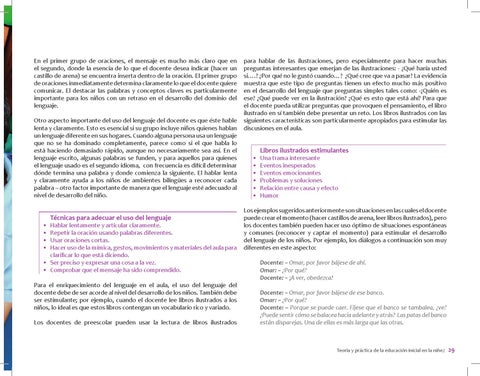 Los ejemplos sugeridos anteriormente son situaciones en las cuales el docente puede crear el momento (hacer castillos de arena, leer libros ilustrados), pero los docentes también pueden hacer uso óptimo de situaciones espontáneas y comunes (reconocer y captar el momento) para estimular el desarrollo del lenguaje de los niños. Por ejemplo, los diálogos a continuación son muy diferentes en este aspecto: Docente: – Omar, por favor bájese de ahí. Omar: – ¿Por qué? Docente: – ¡A ver, obedezca! Docente: – Omar, por favor bájese de ese banco. Omar: – ¿Por qué? Docente: – Porque se puede caer. Fíjese que el banco se tambalea, ¿ve? ¿Puede sentir cómo se balacea hacia adelante y atrás? Las patas del banco están disparejas. Una de ellas es más larga que las otras.