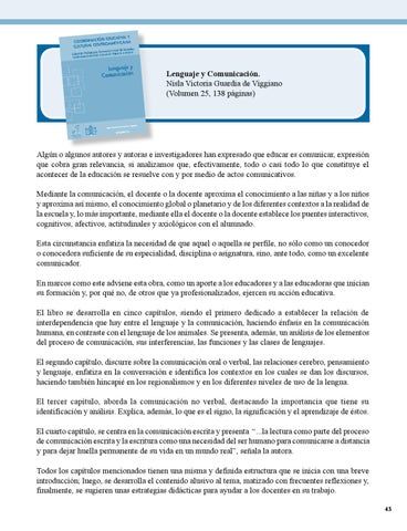 Algún o algunos autores y autoras e investigadores han expresado que educar es comunicar, expresión que cobra gran relevancia, si analizamos que, efectivamente, todo o casi todo lo que constituye el acontecer de la educación se resuelve con y por medio de actos comunicativos. Mediante la comunicación, el docente o la docente aproxima el conocimiento a las niñas y a los niños y aproxima así mismo, el conocimiento global o planetario y de los diferentes contextos a la realidad de la escuela y, lo más importante, mediante ella el docente o la docente establece los puentes interactivos, cognitivos, afectivos, actitudinales y axiológicos con el alumnado. Esta circunstancia enfatiza la necesidad de que aquel o aquella se perfile, no sólo como un conocedor o conocedora suficiente de su especialidad, disciplina o asignatura, sino, ante todo, como un excelente comunicador. En marcos como este adviene esta obra, como un aporte a los educadores y a las educadoras que inician su formación y, por qué no, de otros que ya profesionalizados, ejercen su acción educativa. El libro se desarrolla en cinco capítulos, siendo el primero dedicado a establecer la relación de interdependencia que hay entre el lenguaje y la comunicación, haciendo énfasis en la comunicación humana, en contraste con el lenguaje de los animales. Se presenta, además, un análisis de los elementos del proceso de comunicación, sus interferencias, las funciones y las clases de lenguajes. El segundo capítulo, discurre sobre la comunicación oral o verbal, las relaciones cerebro, pensamiento y lenguaje, enfatiza en la conversación e identifica los contextos en los cuales se dan los discursos, haciendo también hincapié en los regionalismos y en los diferentes niveles de uso de la lengua. El tercer capítulo, aborda la comunicación no verbal, destacando la importancia que tiene su identificación y análisis. Explica, además, lo que es el signo, la significación y el aprendizaje de éstos. El cuarto capítulo, se centra en la comunicación escrita y presenta “...la lectura como parte del proceso de comunicación escrita y la escritura como una necesidad del ser humano para comunicarse a distancia y para dejar huella permanente de su vida en un mundo real”, señala la autora. Todos los capítulos mencionados tienen una misma y definida estructura que se inicia con una breve introducción; luego, se desarrolla el contenido alusivo al tema, matizado con frecuentes reflexiones y, finalmente, se sugieren unas estrategias didácticas para ayudar a los docentes en su trabajo. 43