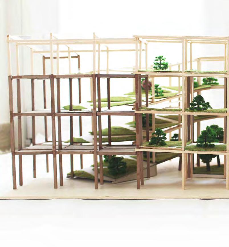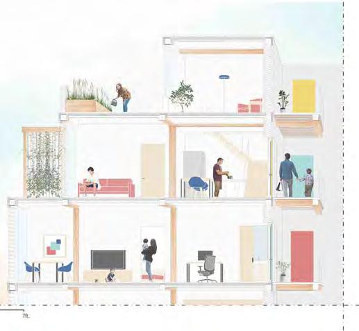 All of the housing within this proposal will follow a 12x12 modular grid filled in by interior or exterior panels. Modularity increases building efficiency and in terms of design provides flexibility within the units. Our units are interlocking, while designated walls for plumbing and amenities can be stacked and shared vertically to maintain consistency. The main materials we are using for this project are mass timber for the modular grid, prefabricated panels (both interior and exterior), retractable and fixed screens, and glazing for the perimeter. The project should feel bright and welcoming—our hope is to invoke the dream of every kid to own a treehouse. The name “Treehouse” invokes feelings of play, lightness, airiness, curiosity, and nature. The design seeks to highlight the importance of outdoor spaces for both the individuals living within the complex and for the community at large. Circulation, balconies, roof terraces, and playgrounds are all located outdoors.