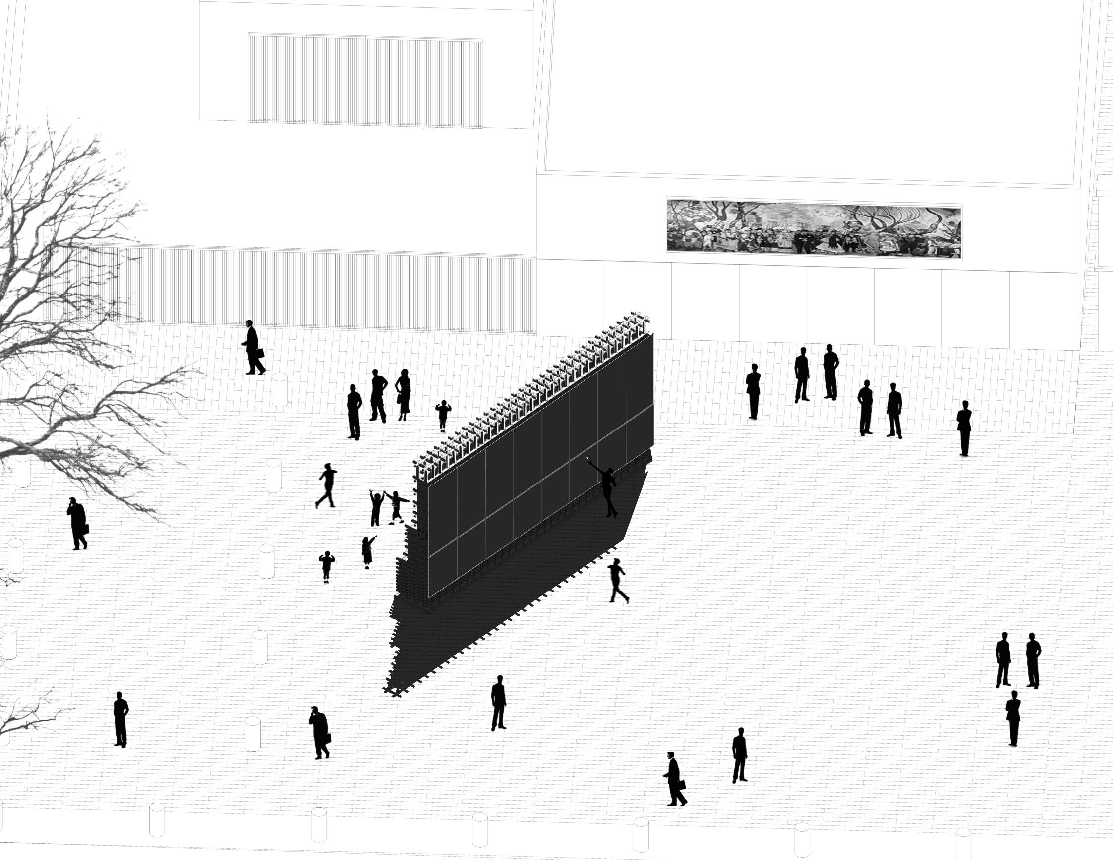 El Frontón representa el tema del espacio para jugar en la ciudad. Concebido como un muro para el juego de pelota, es un recordatorio de la importancia del juego dentro del espacio público y del valor del tiempo libre para el desarrollo de las personas. El ambiente lúdico, busca expresar el devenir de la ciudad.