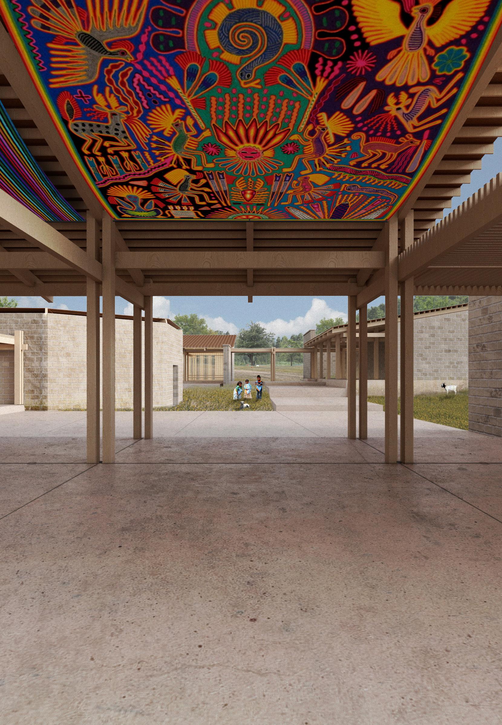 Otro elemento importante de los interiores es el uso de telas producidas en los talleres, estas funcionan como plafones de los espacios más públicos y ayudan a darle algo de identidad a la construcción.