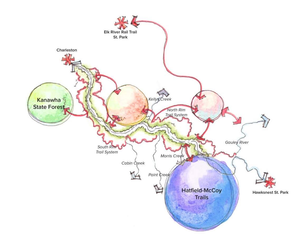 The 2019 The Valley Masterplan formulated the concept of integrating lodging and outdoor recreational opportunities within the Upper Kanawha Valley and specifically the location where the proposed Appalachian Outlaw Trails resides. The adjacent map is a snip from the original “The Valley Masterplan” depicting a 30+ mile long stretch of the Kanawha River with programmatic elements connecting throughout the region. The different colored shapes represent the major attractors in the area. The interventions in this original plan included tourism and community improvements including share the road trails, boat and kayak access, welcome centers, diverse lodging opportunities, motorized and non-motorized trail networks, and other potential opportunities spanning the valley. The purpose the masterplan was to showcase the incredible economic impact connecting regional recreation and toursim opportunity to entince individuals and the Kanawha and Fayette County to further develop projects throughout the valley. The Appalachian Outlaw Trails project is situated in the area that was determined as 4x4 off -road excursion. The Appalachian Outlaw Trails Masterplan is the next steps of detailing one element of The Valley Masterplan and will be major contribution for the Upper Kanawha Valley’s future as an outdoor recreation destination.