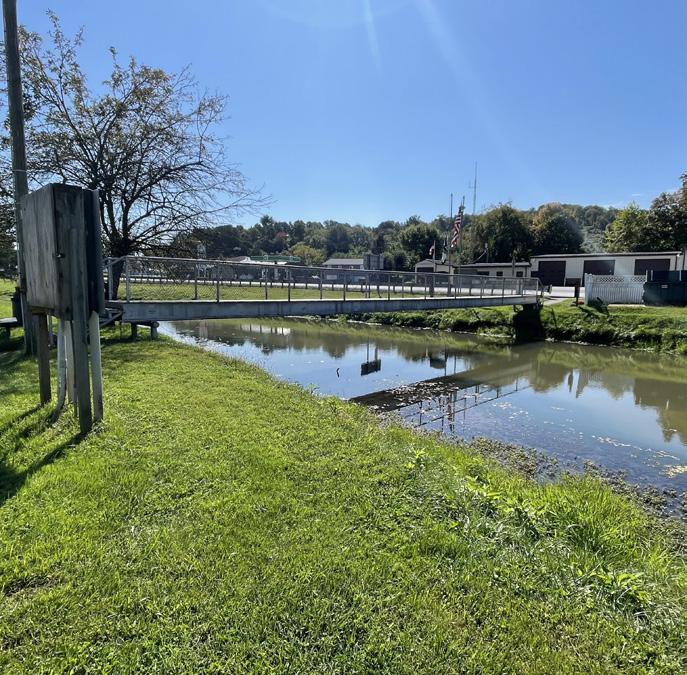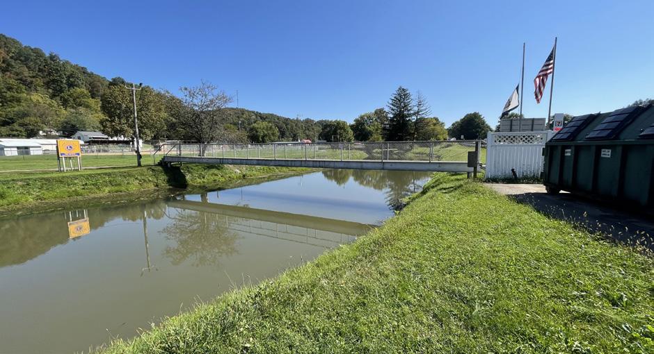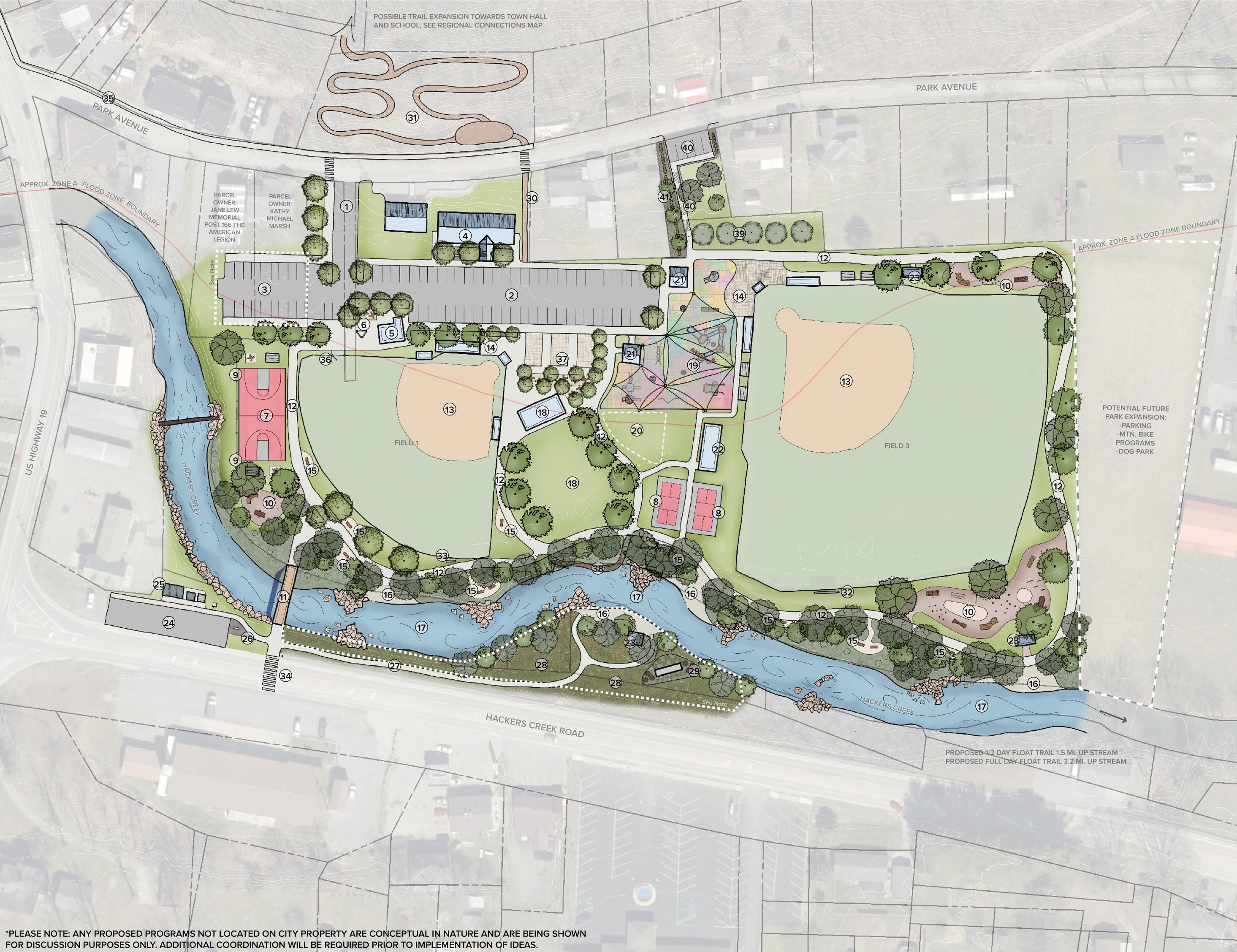 • Potential removal of the existing dam on Hackers Creek. This dam was originally created as a water intake facility to support the town's public water needs. Their water is now purchased through American Water and the dam no longer functions as utility infrastructure. This removal will help to mitigate park flooding, promote fish passage along the watershed, and extend recreational opportunities downstream and create a connection to the West Fork River.