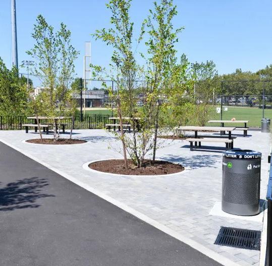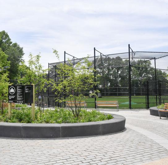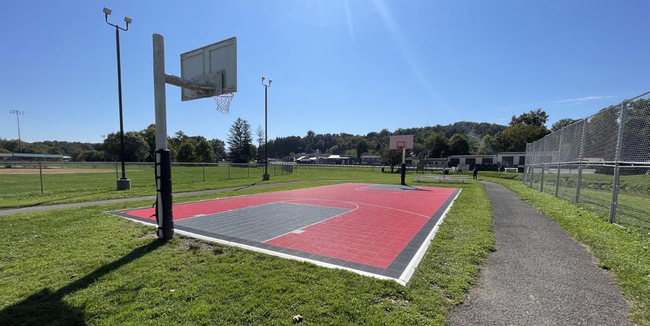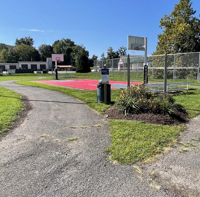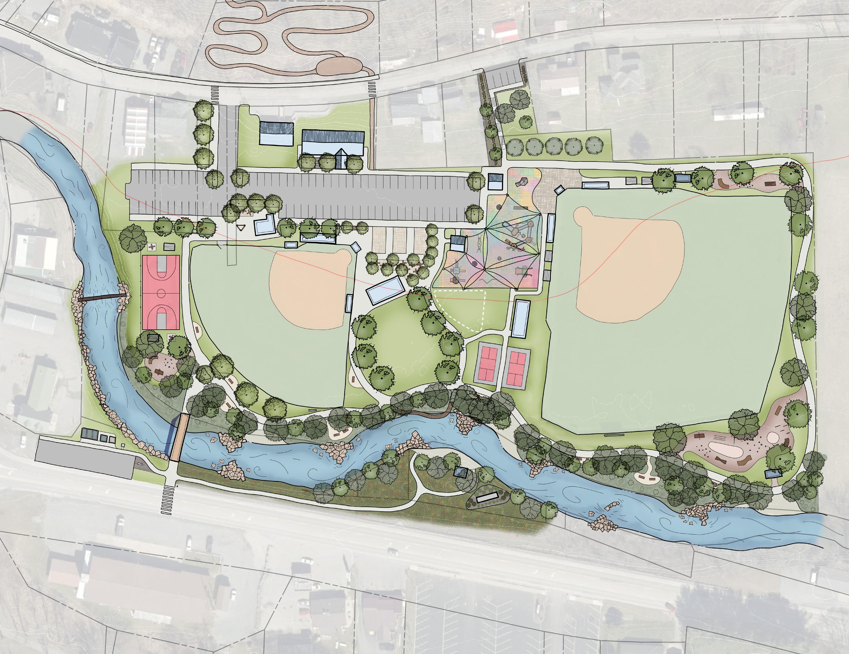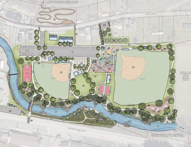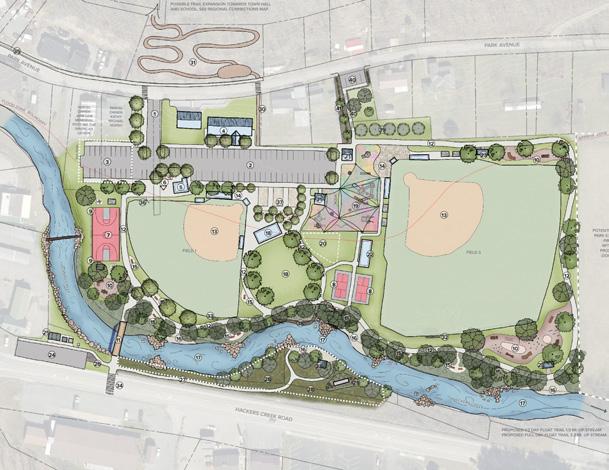 The proposed Jane Lew Park Masterplan, pictured right, enhances existing park amenities and integrates them with new park programs. This creates a cohesive design that balances the need for local sports facilities with the desire for a return to a community park atmosphere at Jane Lew Park. A widened park entrance is being proposed that accommodates both pedestrians and vehicles, which enters into a newly surfaced and reorganized parking lot. ADA and accessibility concerns have been addressed, including replacement of the pedestrian bridge and redesign of the Park Building entrance. A new playground is being proposed that accommodates a community need for equipment that is wheelchair accessible, while maximizing the amount of play space and providing much needed shade. The addition of pickleball and expansion of the existing basketball court to full size enhances sport related amenities in the park. Following the town's guidance, the smaller baseball field is removed and the area re-envisioned with additional park amenities. Proposed improvements around the remaining ball fields and existing restroom help address known concerns in these areas while aiding to the creation of a park-like atmosphere. Additionally, the plan makes use of Hackers Creek. This underutilized natural feature forms the southern park boundary and the plan proposes to re-naturalize the creek with opportunities for park visitors to interact with the water. An event area is being proposed in the park center, where former ball field 2 was located, allowing the town to better accommodate large events and opening the door to possible new park programing. Finally, mountain bike programs have been integrated into the new park design, providing a unique amenity for the town. A 10’ wide multi use path replaces the existing asphalt walking trail and connects park users to all amenities in the park. The proposed design creates new opportunities to connect to regional recreation systems, solidifying Jane Lew’s place in an ever growing outdoor recreation economy within the state.