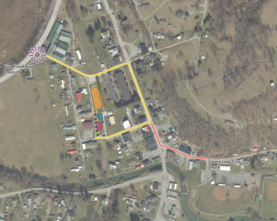 Completed by CEC in 2022, the Lewis County Greenway is a trail feasibility study that proposes a 40+ mile, county wide long distance trail. It connects several towns and regional attractions together, including Jane Lew, Weston, Jackson’s Mill, and Stonewall Resort. In addition, it connects the local towns to 150+ miles of existing trails and nearly 31,000 acres of public lands. Jane Lew is a trail head location along this greenway. By providing unique recreational features at the town park, opportunities exist to attract people off of the trail, through town, and into the town park. This leaves Jane Lew Park (and the town) as a regional recreation hub and has the potential to support the economic development of local town businesses via increased foot traffic past local storefronts. Proposed recommendations included in this masterplan help support this idea of Jane Lew becoming a recreation hub along the Lewis County Greenway.