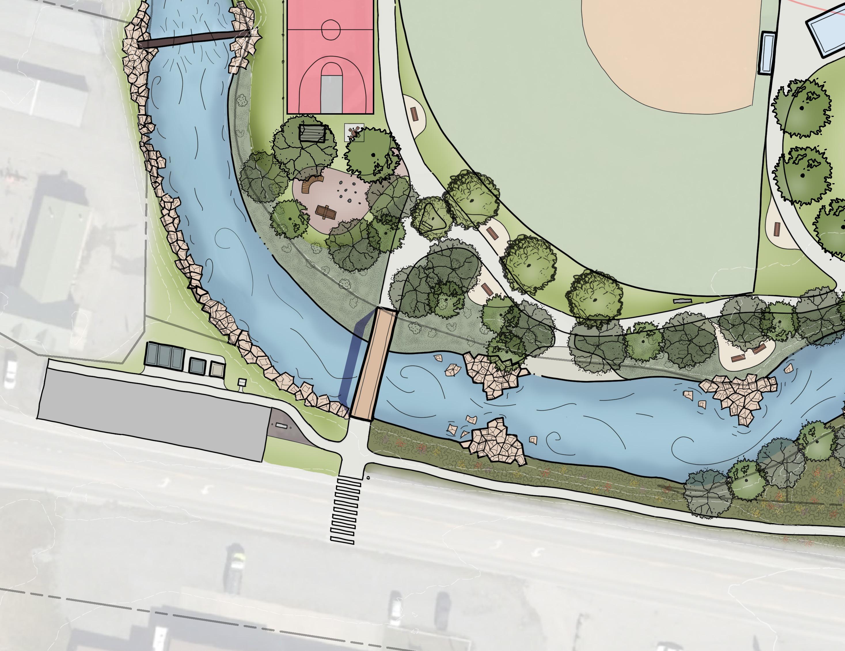 This masterplan for Jane Lew Park envisions a future where Hackers Creek plays a larger role in supporting recreation in the park. A beautiful natural asset, the masterplan proposes to re-naturalize the feature and create interventions that bring park