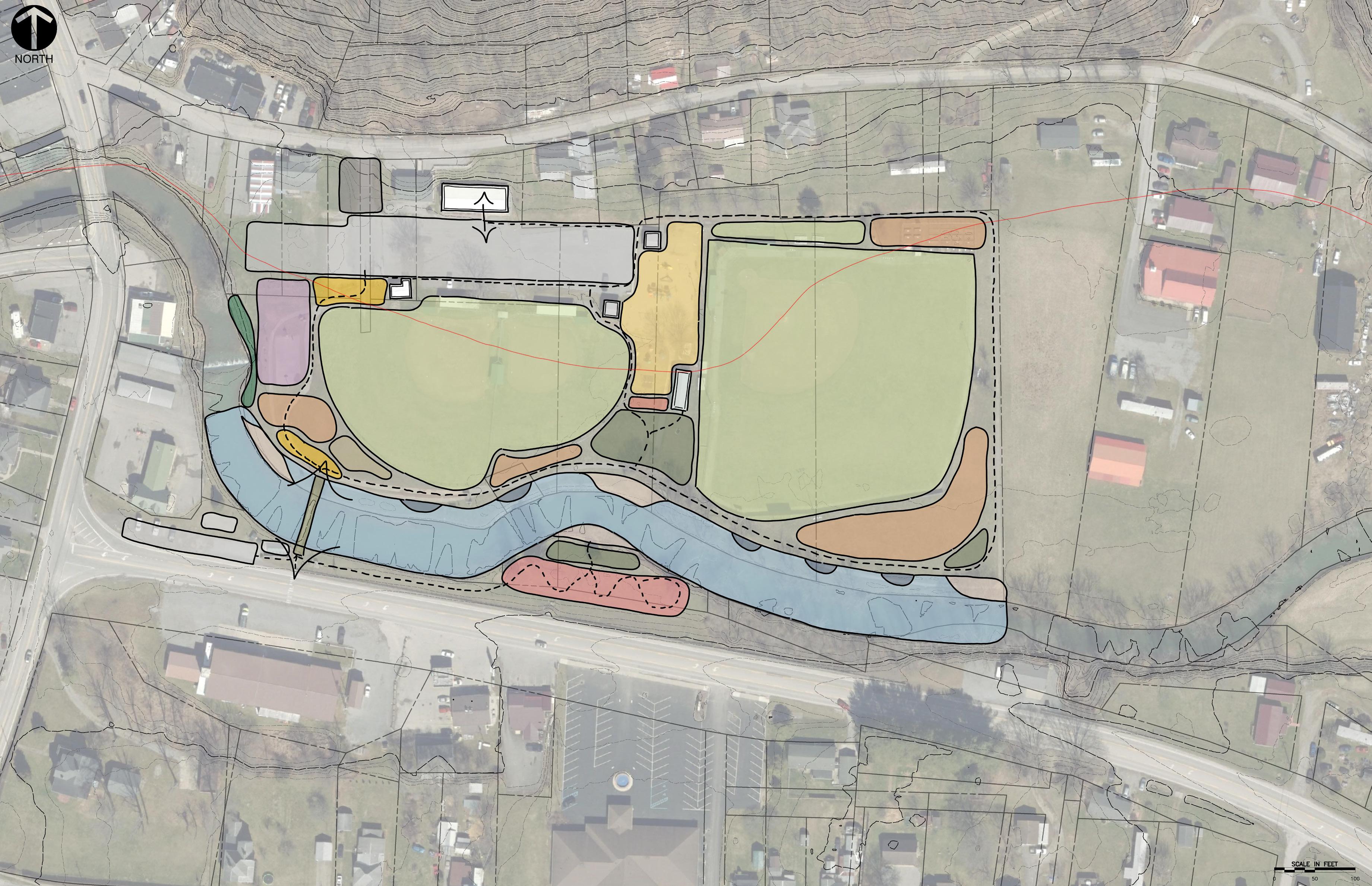 Although it is not currently part of the Jane Lew Park property, an area of land adjacent to the site has been identified as an opportunity to expand the park. Having several land owners, including the DOH, this is a proposed idea only for discussion purposes. Additional conversations will have to occur between the town and respective land owners to determine if the town can utilize this land for park purposes. The masterplan sees this area as an opportunity to create passive park features during the process of re-naturalizing the creek bank.