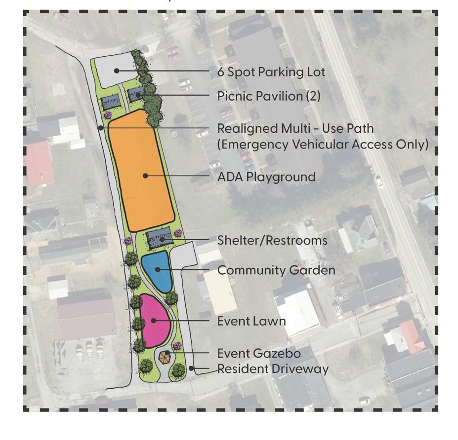 Proposed Jane Lew Pocket Park, proposed as part of the Lewis County Greenway. Located behind Town Hall, it would form an important connector between town and the long distance trail.