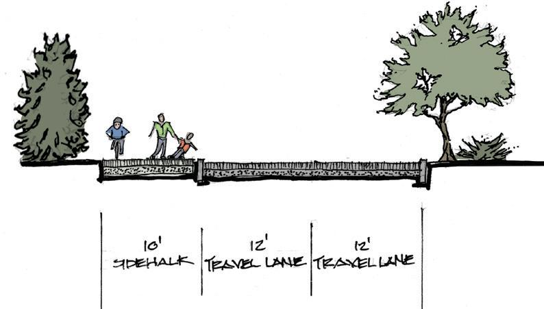 a The existing parking lot at Jane Lew Park is inconsistent and appears to have been pieced together overtime. The drive aisles between each ‘section’ of the current parking lot are not aligned. In addition, the parking lot is larger than it needs to be in some areas. A parking lot with a drive aisle and head in parking on either side should be 60’ in width. One instance in Jane Lew Park measures nearly 90’, which is wider than necessary. This inconsistency has led to vehicular conflicts during busy event days. The proposed layout simplifies the parking layout and the new footprint is dimensioned appropriately. This removes unnecessary width, creating additional program opportunities in areas adjacent to the parking lot. Approximately 58 stalls can be created through this reorganization. A sidewalk of varying dimensions (due to the proximity of adjacent property lines) is also added around the parking lot, ensuring safe and connected pedestrian circulation.