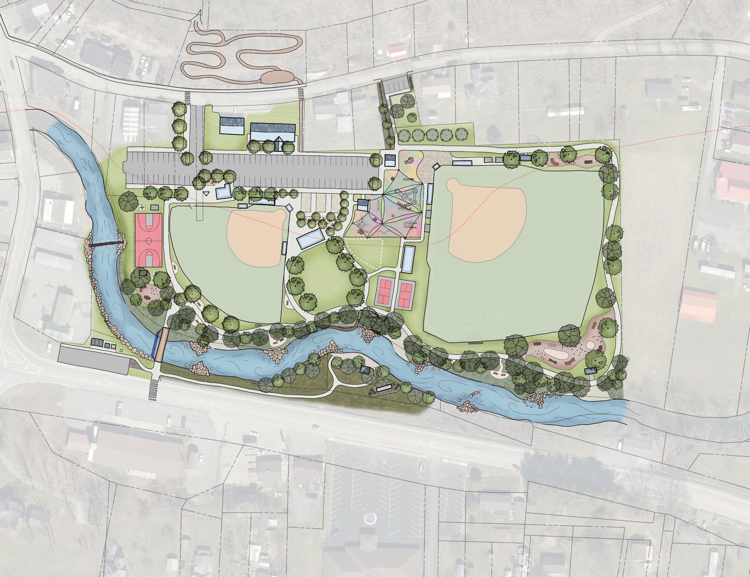 The proposed Jane Lew Park Masterplan is a recreation focused, park improvement strategy. The goal of this document is to enhance existing amenities at the Jane Lew Park while introducing new programs for the benefit of the community. The proposed vision for the public space balances the need for local sports facilities with the desire for a communitycentered park atmosphere. Key components of the plan include, but are not limited to: addressing ADA and general access concerns throughout the park; addition of community requested programs, such as pickleball and a new, all inclusive playground; and the addition of new activities such as mountain biking. A new event lawn and pavilion is also being proposed, creating a centralized location to support the annual festivals and holiday events that attract hundreds of visitors to town each year. In addition, the plan envisions a park that takes greater advantage of the natural beauty provided by Hackers Creek. This is accomplished through re-naturalization of the creek bank and interventions that allow park visitors to interact with the water. Proposed park improvements have the potential to connect into regional recreation systems that are being developed across Lewis County and the State of WV, such as the Lewis County Greenway. This will solidify Jane Lew’s position along these regional systems and help draw users into town and to the Jane Lew Park. Overall, the proposed masterplan not only enriches Jane Lew Park’s offerings, but also positions the town to leverage its outdoor recreation assets, contributing to the broader regional recreation economy.