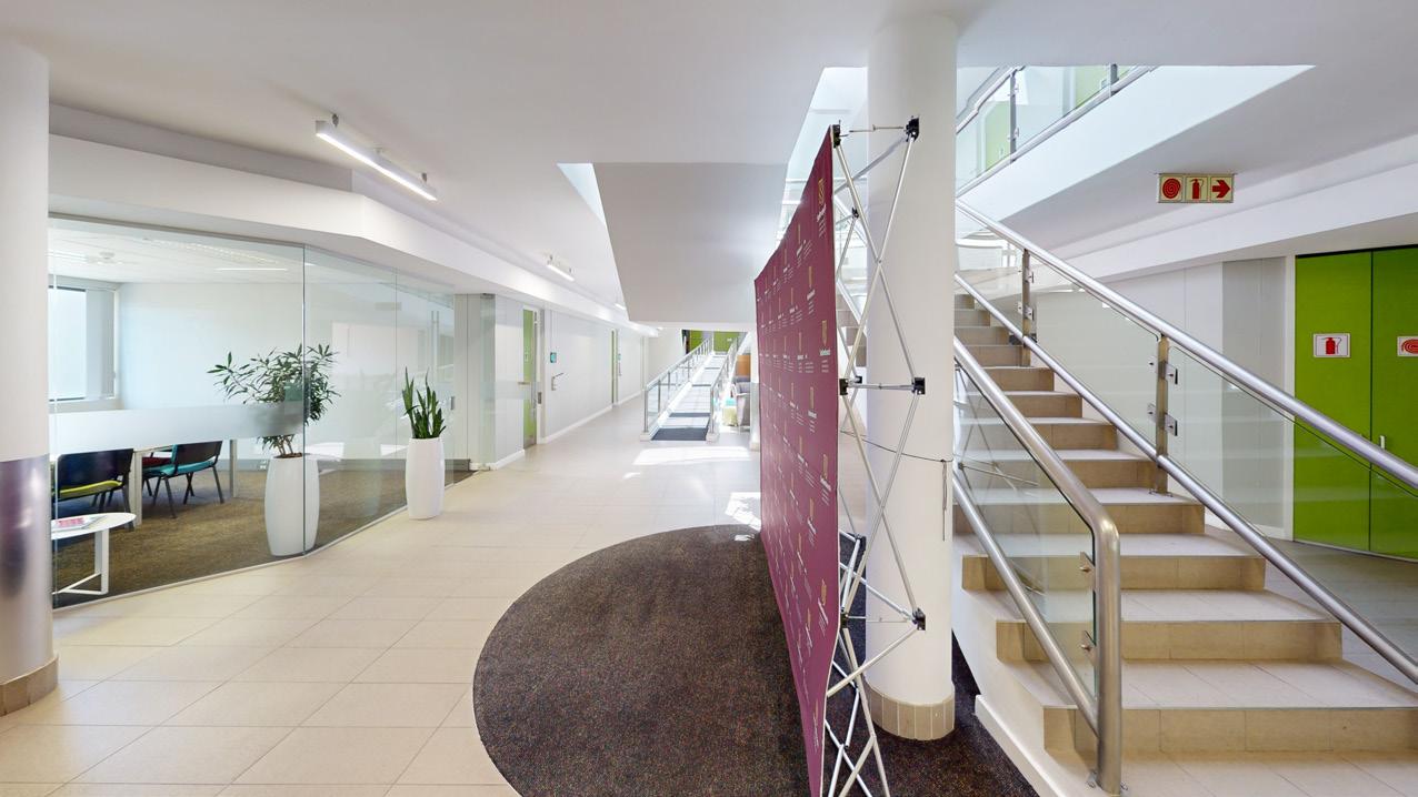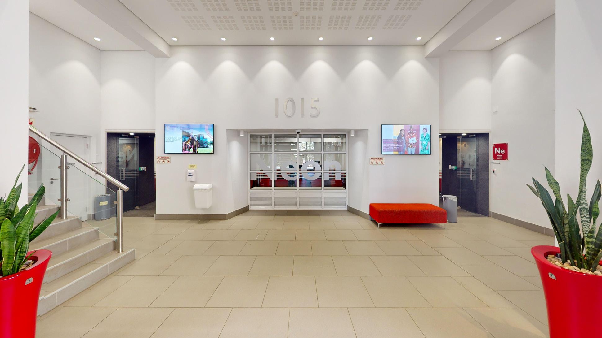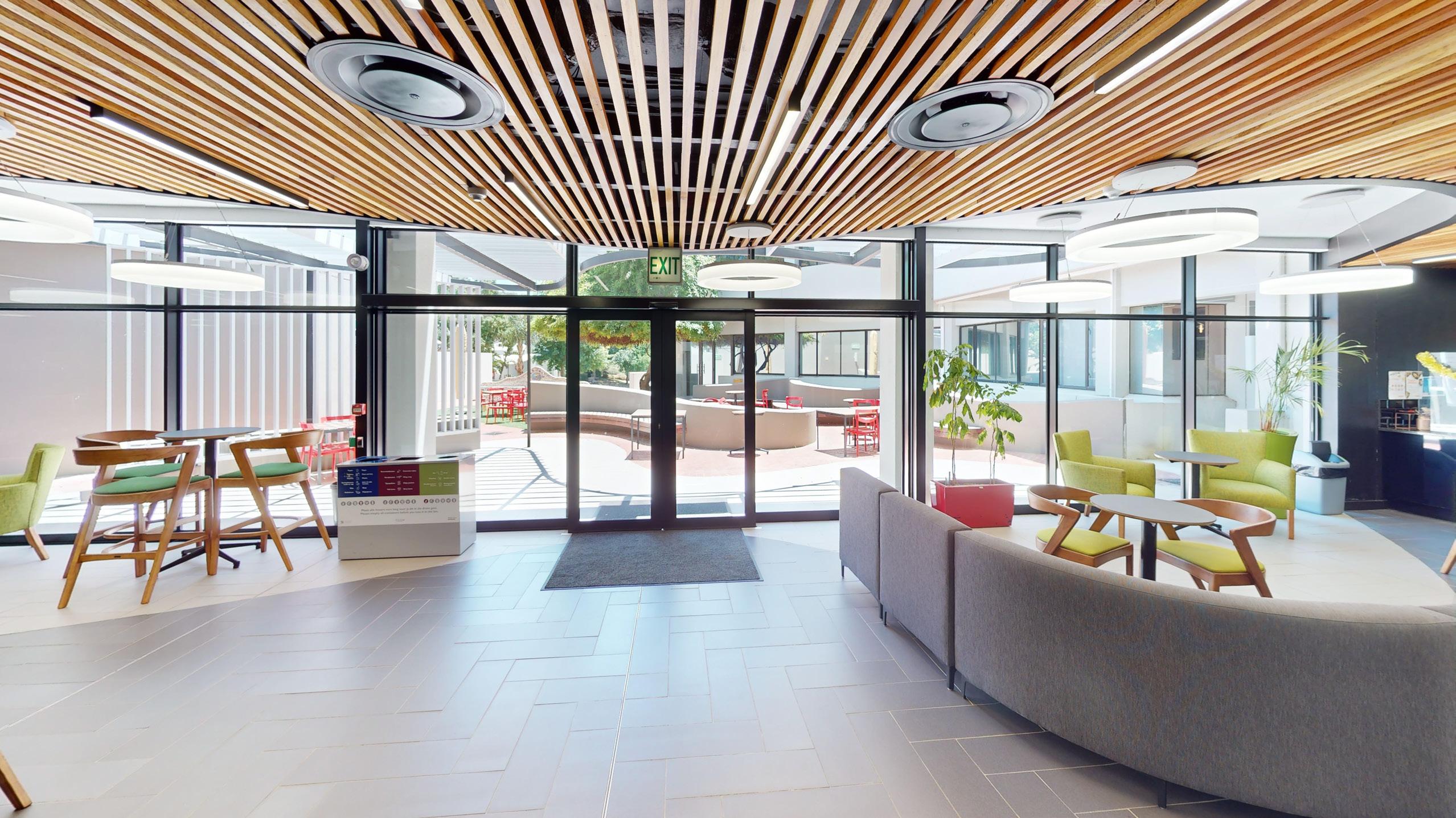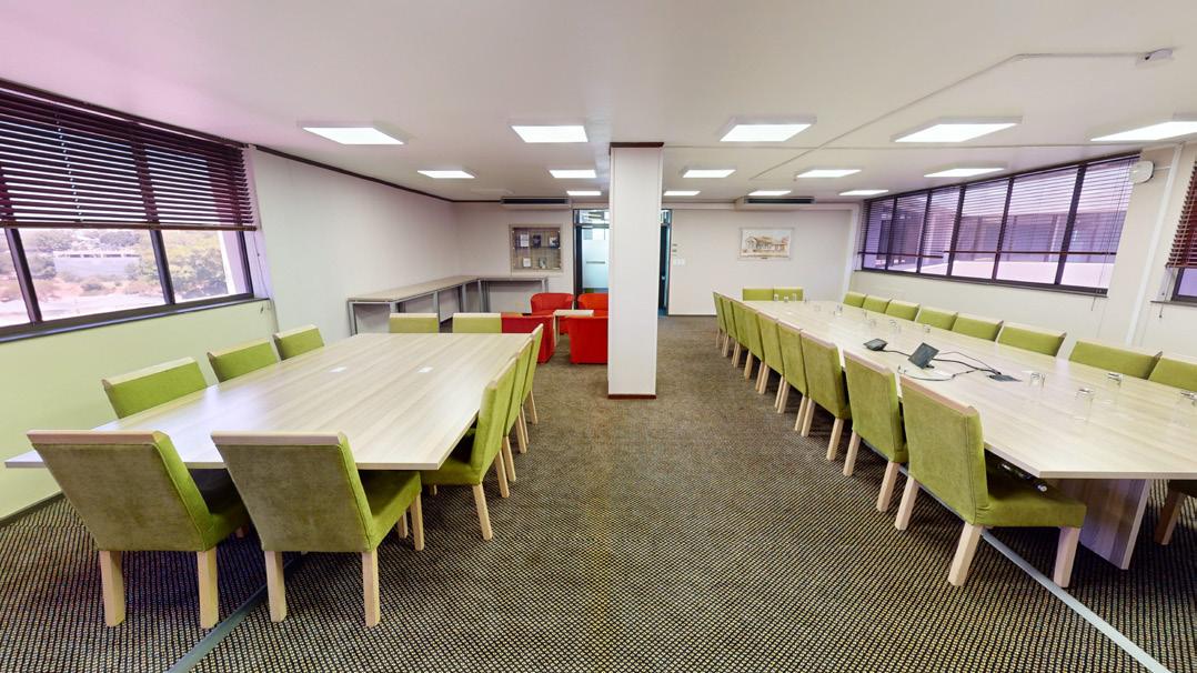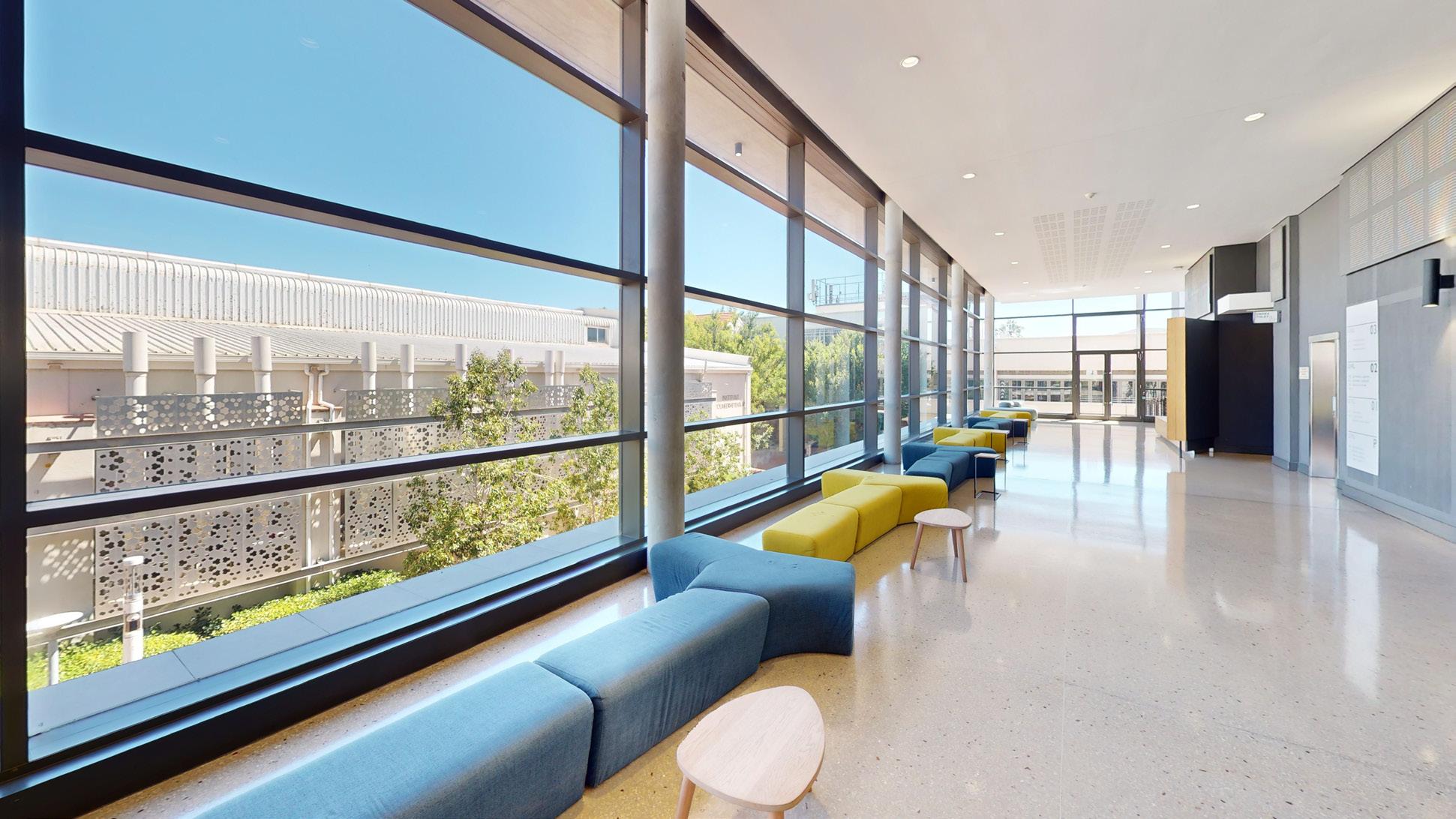This striking building is nestled in the heart of the Stellenbosch Campus, next to the Neelsie Student Center for all your shopping needs. The new building houses state-of-the-art technological infrastructure for future-orientated lectures, streaming, conferencing, and groupwork classes. Green star certification. Sustainability initiatives are implemented.