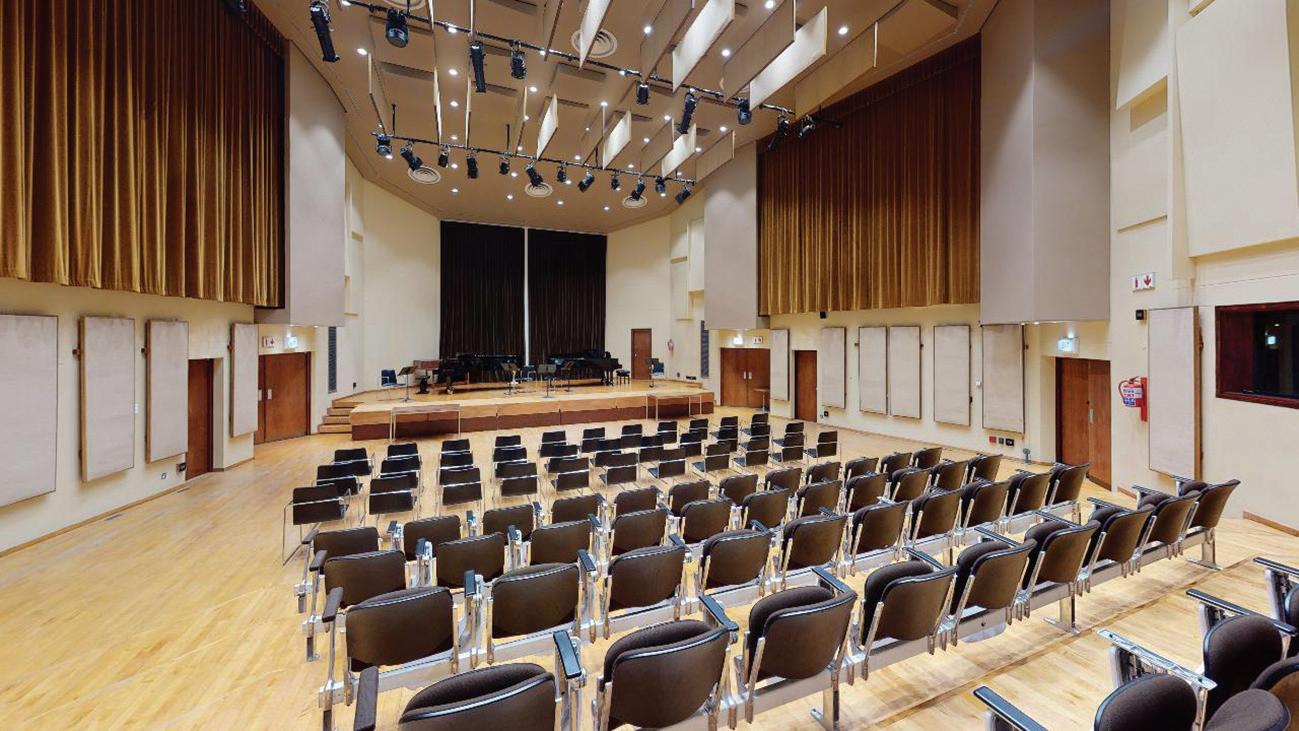 The Fismer Hall is suited exceptionally for a smaller audience. The hall can seat 200 people when filled to capacity with loose chairs. Fitted with 60 fixed chairs, the hall also boasts a wooden sprung floor. The hall also boasts recording studio facilities and lighting to facilitate video recording.