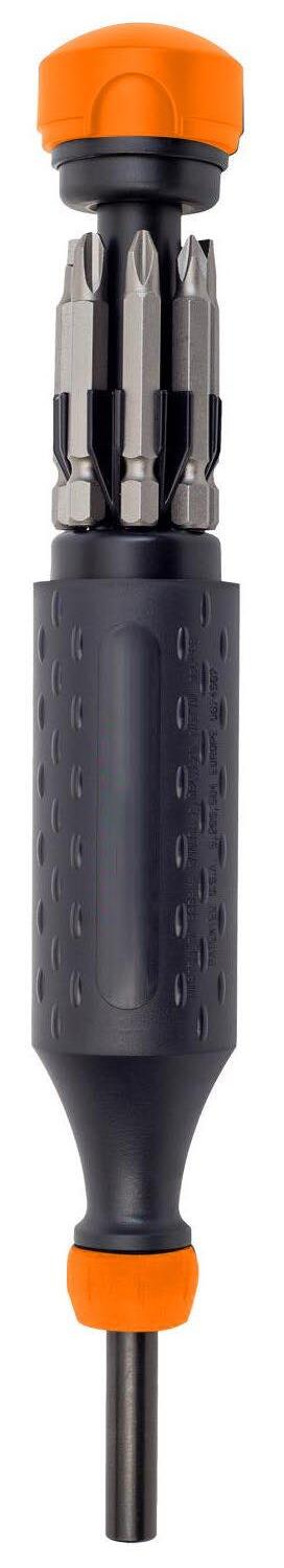 7.5" long. Loaded with 7 durable industrial-grade steel bits at the end of the tool. Includes Slot (flat) bit 6, Slot (flat) bit 4, Phillips bit 1, Phillips bit 2, Phillips bit 3, Torx bit 15, Square bit 2, and a Hex Nut Driver at the end of the shaft.
