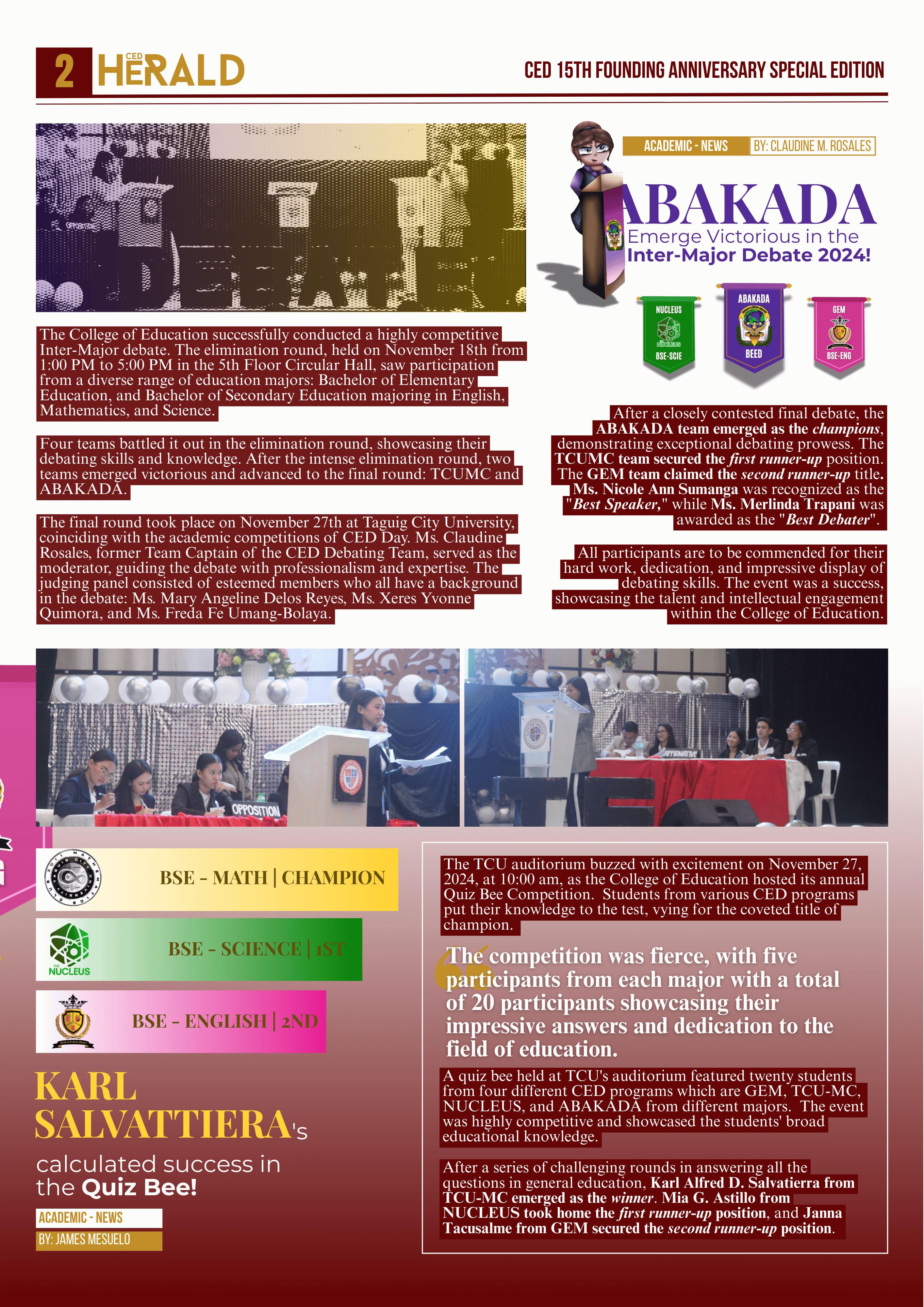 On November 27, 2024, as the College of Education celebrated its 15th Founding Anniversary, the Dance Sports Competition held at the TCU Auditorium witnessed Karl Alfred D. Salvatierra and Nicole Anne C. Sumanga emerged as champions.