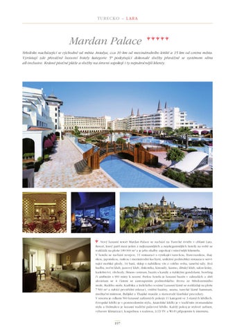 Nový luxusní resort Mardan Palace se nachází na Turecké riviéře v oblasti Lara. Resort, který patří mezi jeden z nejluxusnějších a nejelegantnějších hotelů na světě se rozkládá na ploše 180 000 m2 a je jeho služby uspokojí i náročnější klientelu. V hotelu se nachází recepce, 11 restaurací s vynikající tureckou, francouzskou, thajskou, japonskou, ruskou i mezinárodní kuchyní, unikátní podmořská restaurace servírující mořské plody, 14 barů, sklep s nabídkou vín z celého světa, taneční sály, živá hudba, noční klub, jazzový klub, diskotéka, kinosály, kasino, dětský klub, salon krásy, kadeřnictví, obchody, fitness centrum, bazén s kanály a italskými gondolami, bowling či amfiteátr s 900 místy k sezení. Perlou hotelu je luxusní bazén v zahradách a obří akvárium se 4 částmi se zastoupením podmořského života ze Středozemního moře, Rudého moře, Karibiku a Indického oceánu! Luxusní lázně se rozkládají na ploše 7 500 m2 a nabízí prvotřídní relaxaci, vnitřní bazény, saunu, turecké lázně hammam, meditační místnost, Balijské a Thajské masáže a různorodé lázeňské procedury. V resortu je celkem 560 luxusně zařízených pokojů 11 kategorií ve 3 různých křídlech. Evropské křídlo je v postmoderním stylu, Anatolské křídlo je v tradičním otomanském stylu a Dolmahce je luxusní tradiční palácové křídlo. Každý pokoj je stylově zařízen, vybaven klimatizací, koupelnou s toaletou, LCD TV a Wi-Fi připojením k internetu.