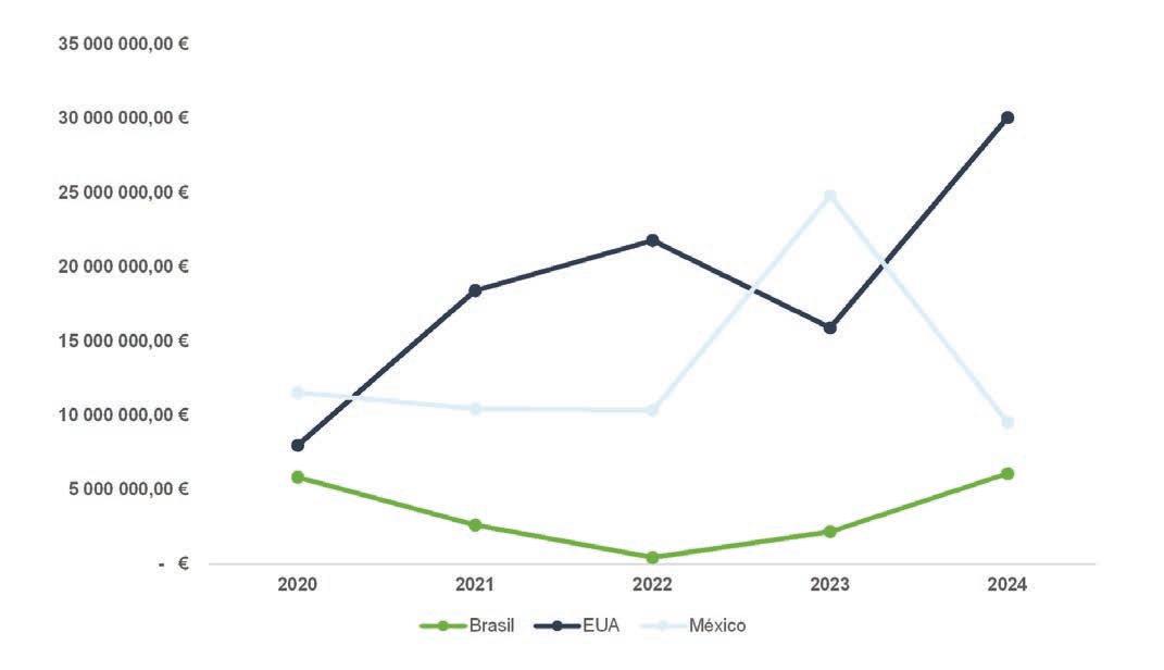 Por outro lado, o México, que até 2023 apresentava uma evolução sem grandes oscilações, viu o valor das suas exportações cair para um valor ligeiramente inferior aos registados entre 20202022.