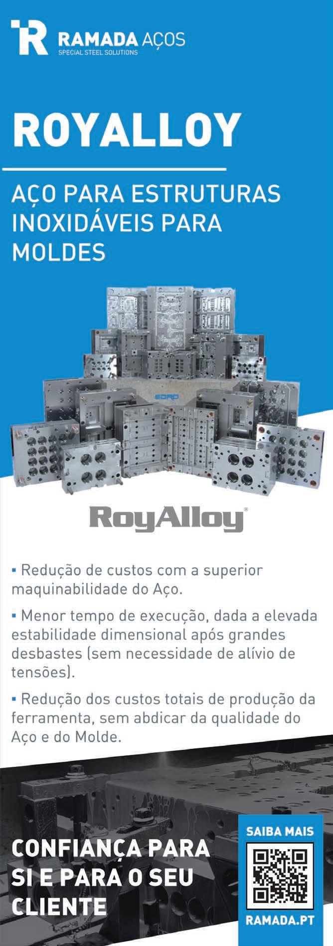 PROPRIEDADE CEFAMOL - Associação Nacional da Indústria de Moldes • CONTRIBUINTE 500330212 • SEDE DO EDITOR, REDAÇÃO E ADMINISTRAÇÃO Centro Empresarial da Marinha Grande - Rua de Portugal, Lt. 18 - Fração A / 2430-028 MARINHA GRANDE - PORTUGAL / T: 244 575 150 / F: 244 575 159 / E: revista_omolde@cefamol.pt / www.cefamol.pt • FUNDADOR Fernando Pedro • DIRETOR Manuel Oliveira • CONSELHO EDITORIAL António Rato, Eduardo Pedro, Luís Abreu e Sousa, Manuel Oliveira, Maria Arminda • TEXTOS Ana Pires, António Baptista, Armando Bastos, Artur Ferraz, Carlos Ribeiro, Carolina Feliciana Machado, Carolina Neves, Diana Dias, Eduardo Oliveira, Emanuel Silva, Gilberto Martins, J. Paulo Davim, Helena Silva, Maxime Daniel, Miguel Nuno Silva, Nuno Martinho, Raúl Souto, Rita Diniz, Rita Marques, Rui Rocha, Sílvia Cruz, Tânia Mendes, Vítor Ferreira • PUBLICIDADE Rui Joaquim • PRODUÇÃO GRÁFICA Colorestúdio – Artes Gráficas, Lda / Zona Industrial Casal da Azeiteira, Pav. 3 - Quintas do Sirol - 2420-345 St.ª Eufémia - Leiria / T: 244 813 685 / E: colorestudio.lda@gmail.com • PERIODICIDADE Trimestral • TIRAGEM 500 exemplares • DEPÓSITO LEGAL 22499/88 • REGISTO ERC 113 153 • Nº ISSN 1647-6557 • Estatuto Editorial encontra-se disponível em www.cefamol.pt