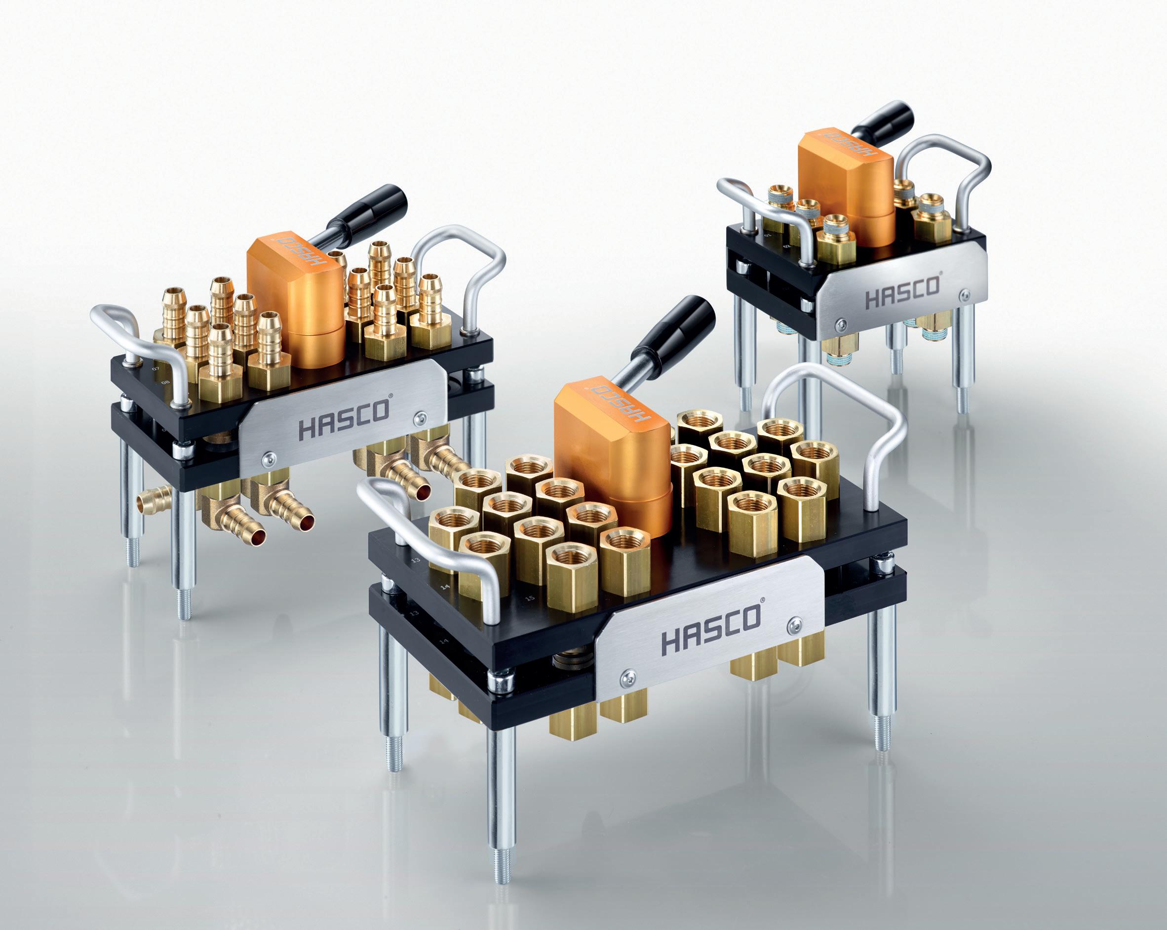 O sistema de acoplamento de fecho múltiplo da HASCO permite a conexão de circuitos de regulação da temperatura num só passo. Os processos de configuração podem ser executados de forma rápida e fácil, sem o risco de confundir os tubos.