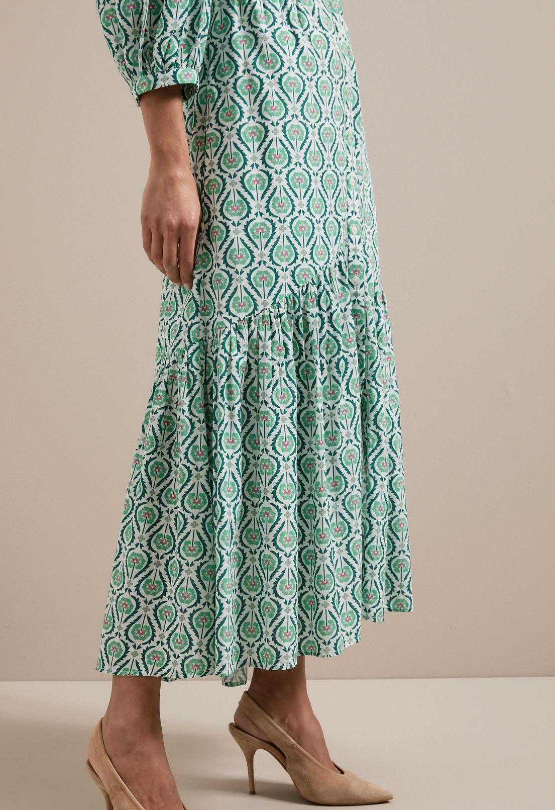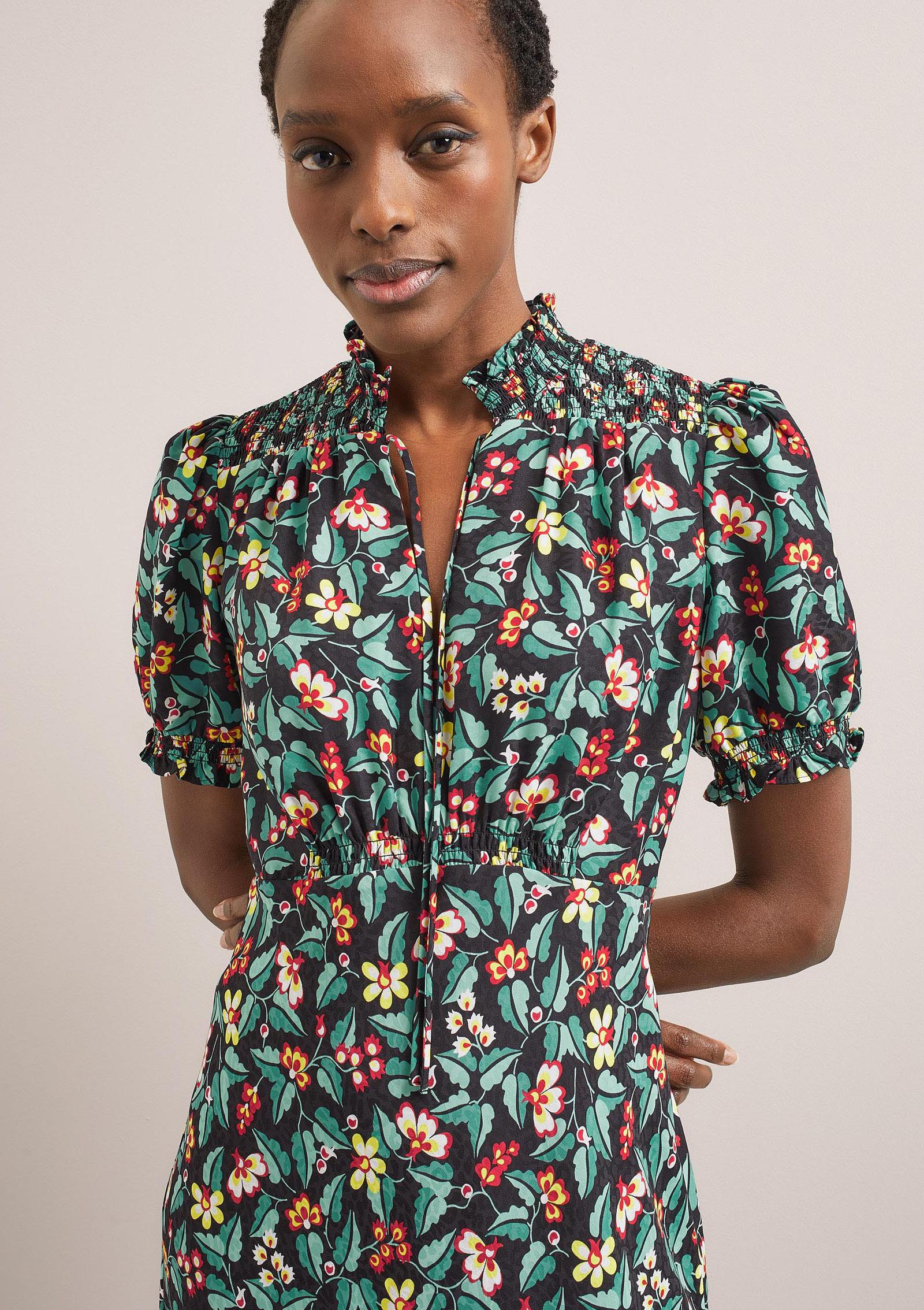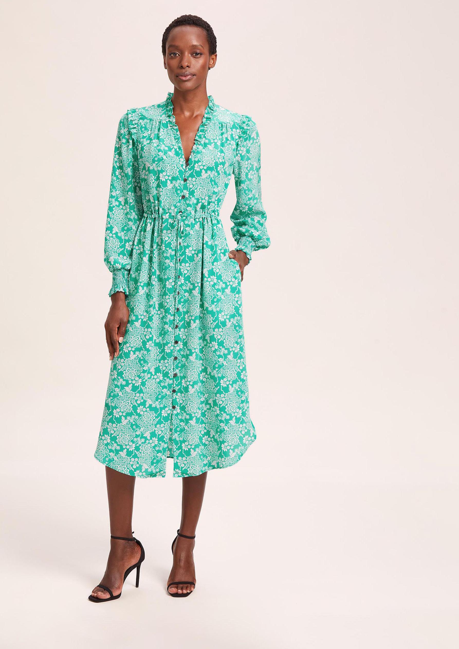 Stella Midi Dress with Drawstring Waist in 100% Silk Crêpe de Chine Green Damask Print. Also available in Hot Pink Damask Print and Blue Leopard Pansy Print. £450