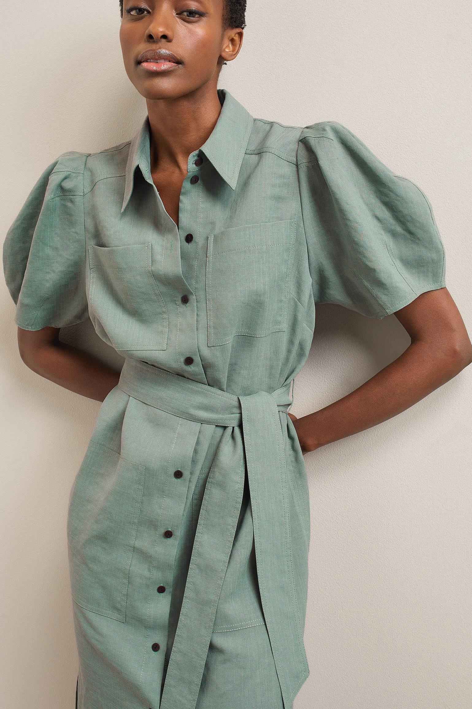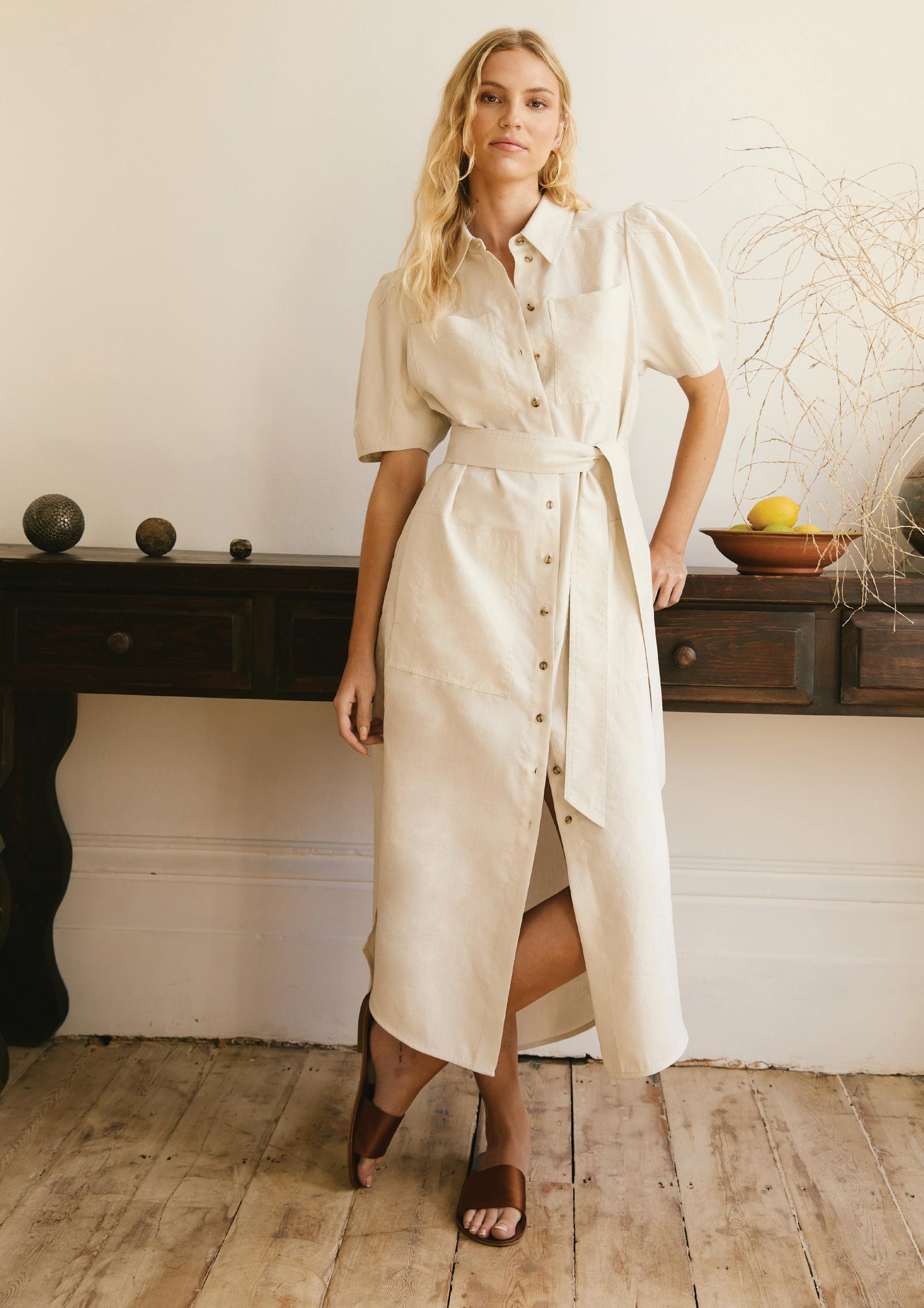 Lyra Techni Linen Maxi Shirt Dress Cream. Also available in Navy and Sage Green. Machine washable. £375