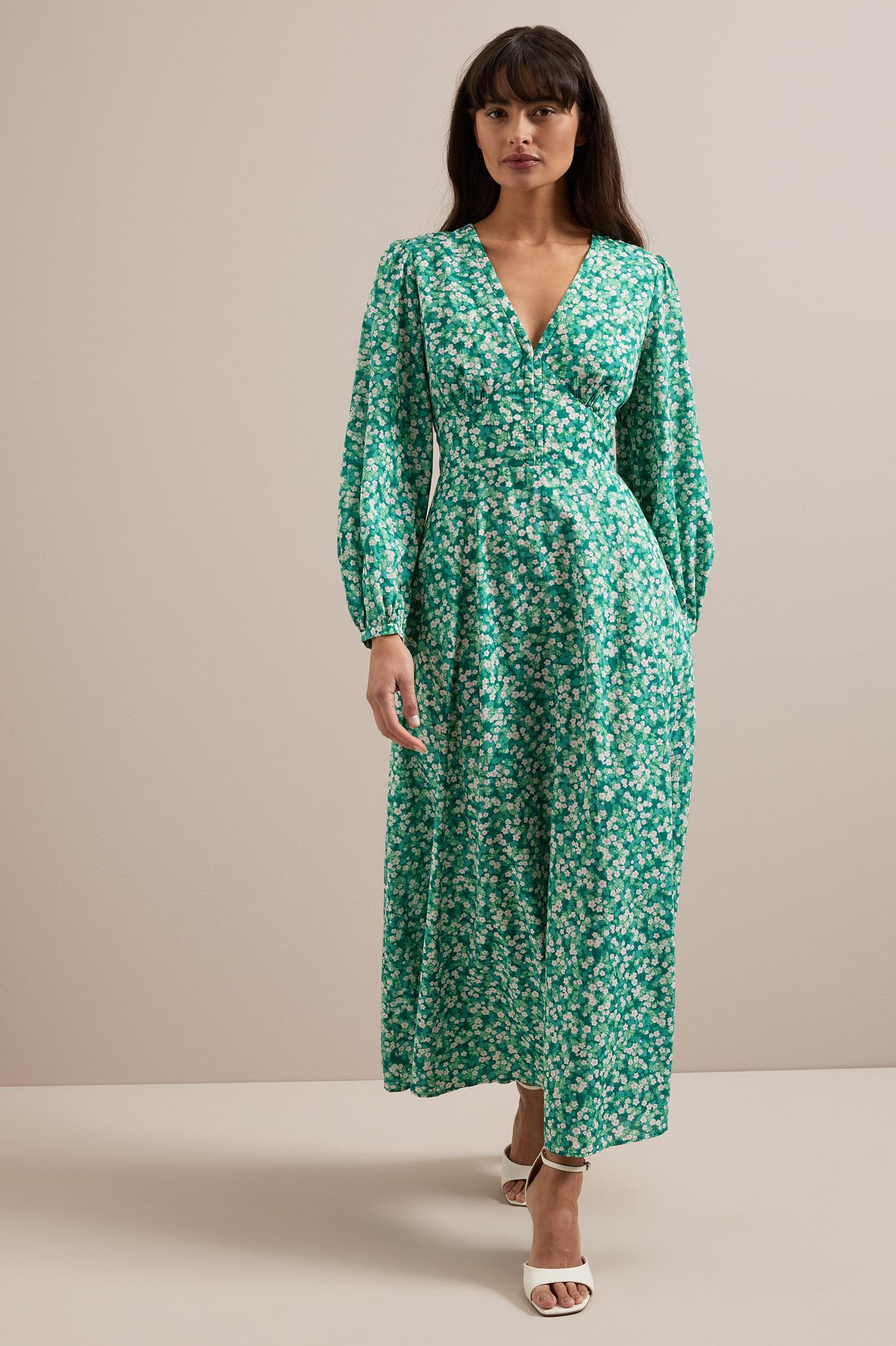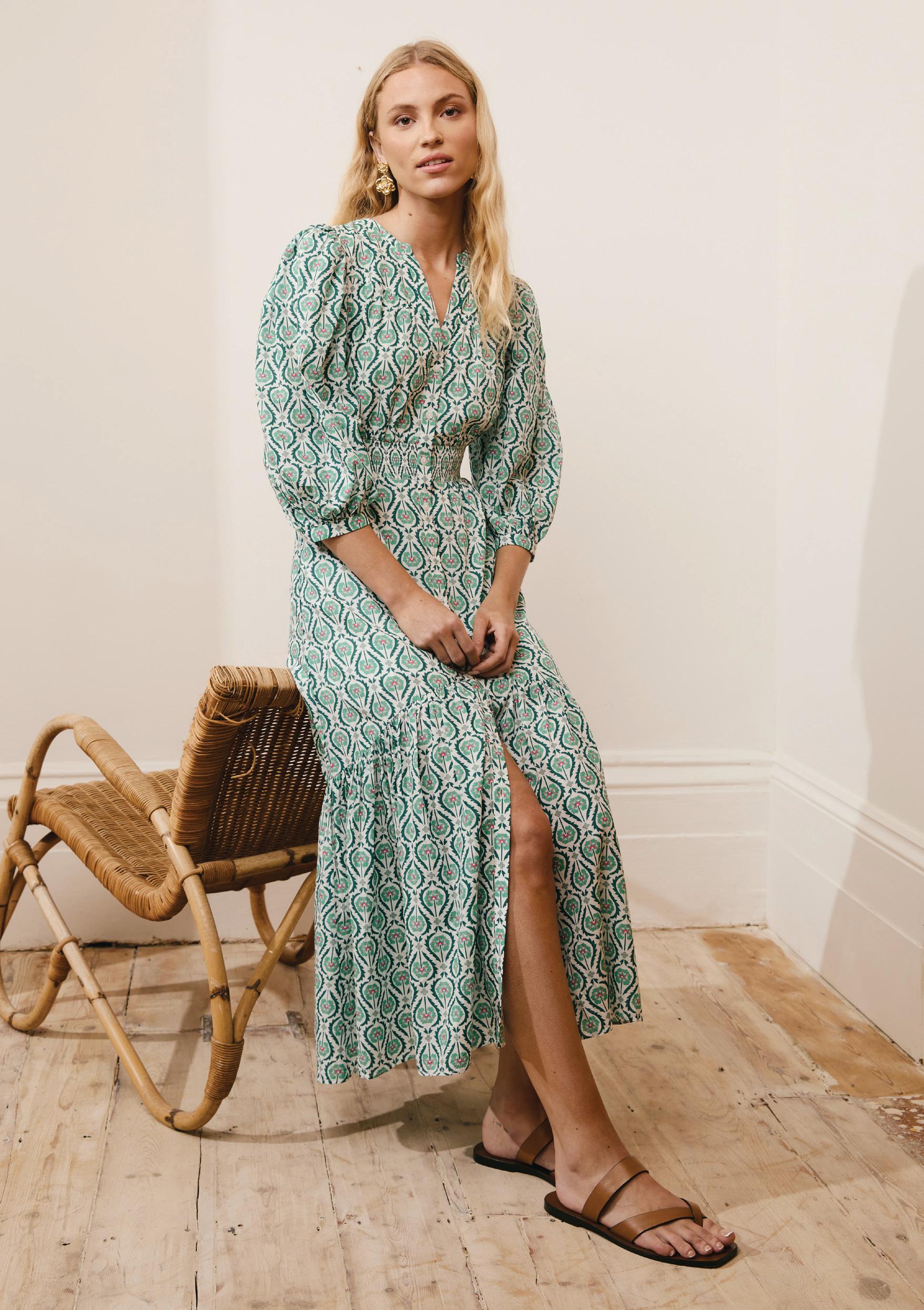 Aspen Maxi Dress with Shirred Waist in Cotton Voile White/Green Tudor Rose Print. Also available in Blue Ditsy Carnation Print. Machine washable. £290