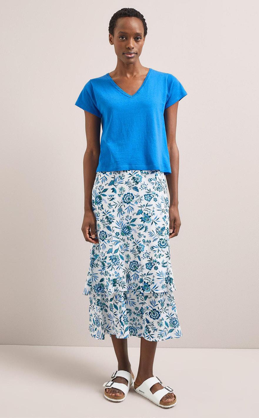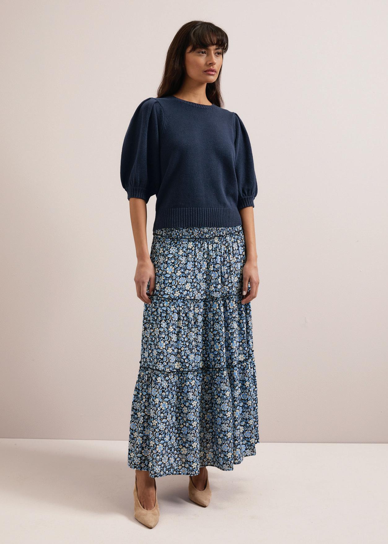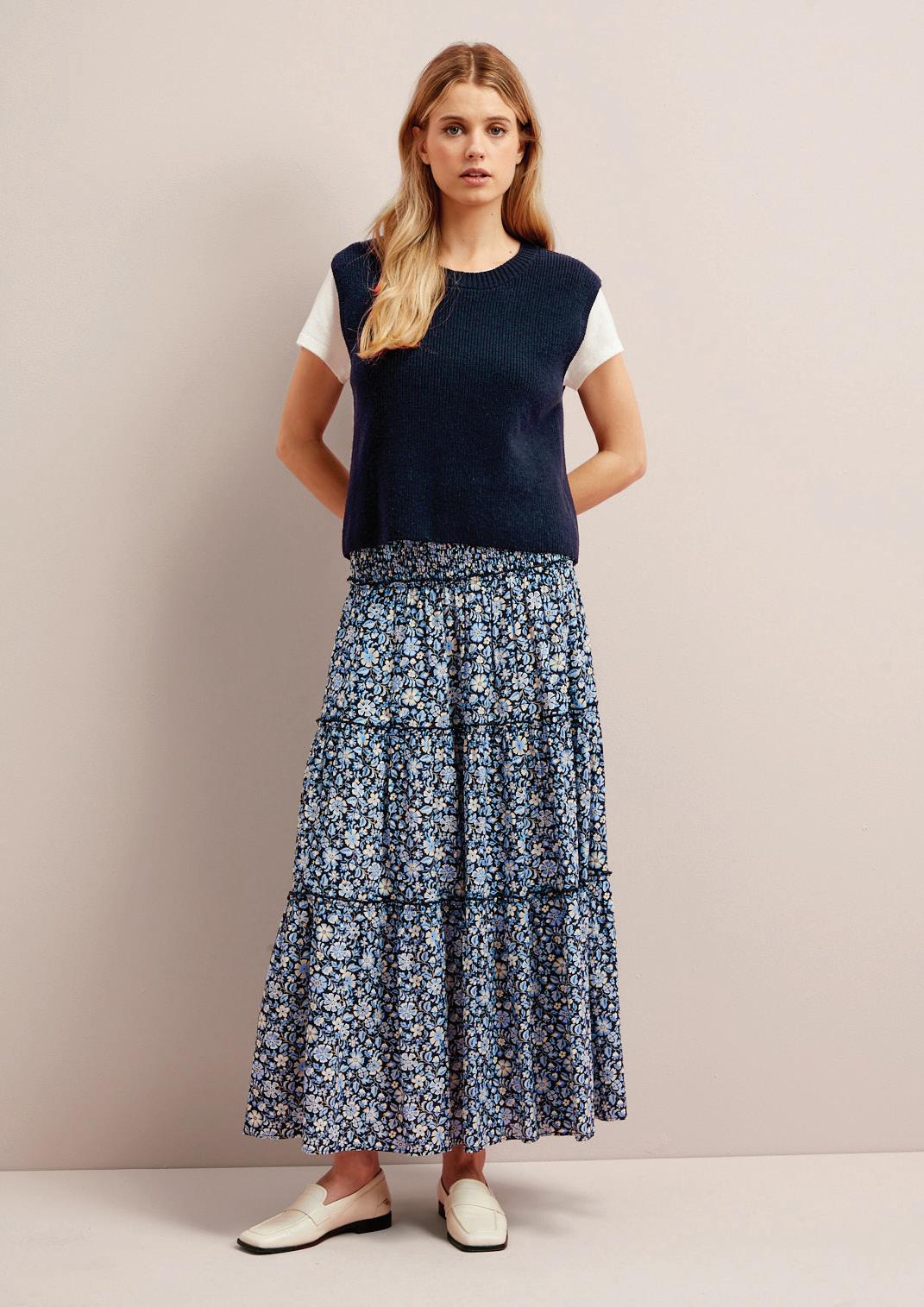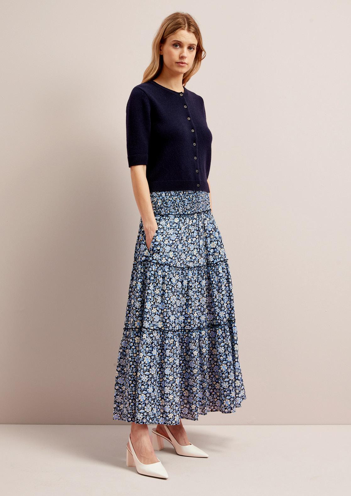 Kira Tiered Maxi Skirt with Shirred Waist in Cotton Voile Blue Ditsy Carnation Print. Machine washable. £190
