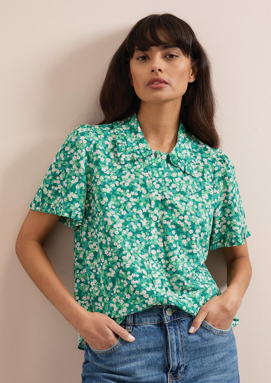 Pippi Collared Blouse in Cotton Voile Mid Green Blossom Print. Also available in Hot Pink Blossom Print. Machine washable. £130