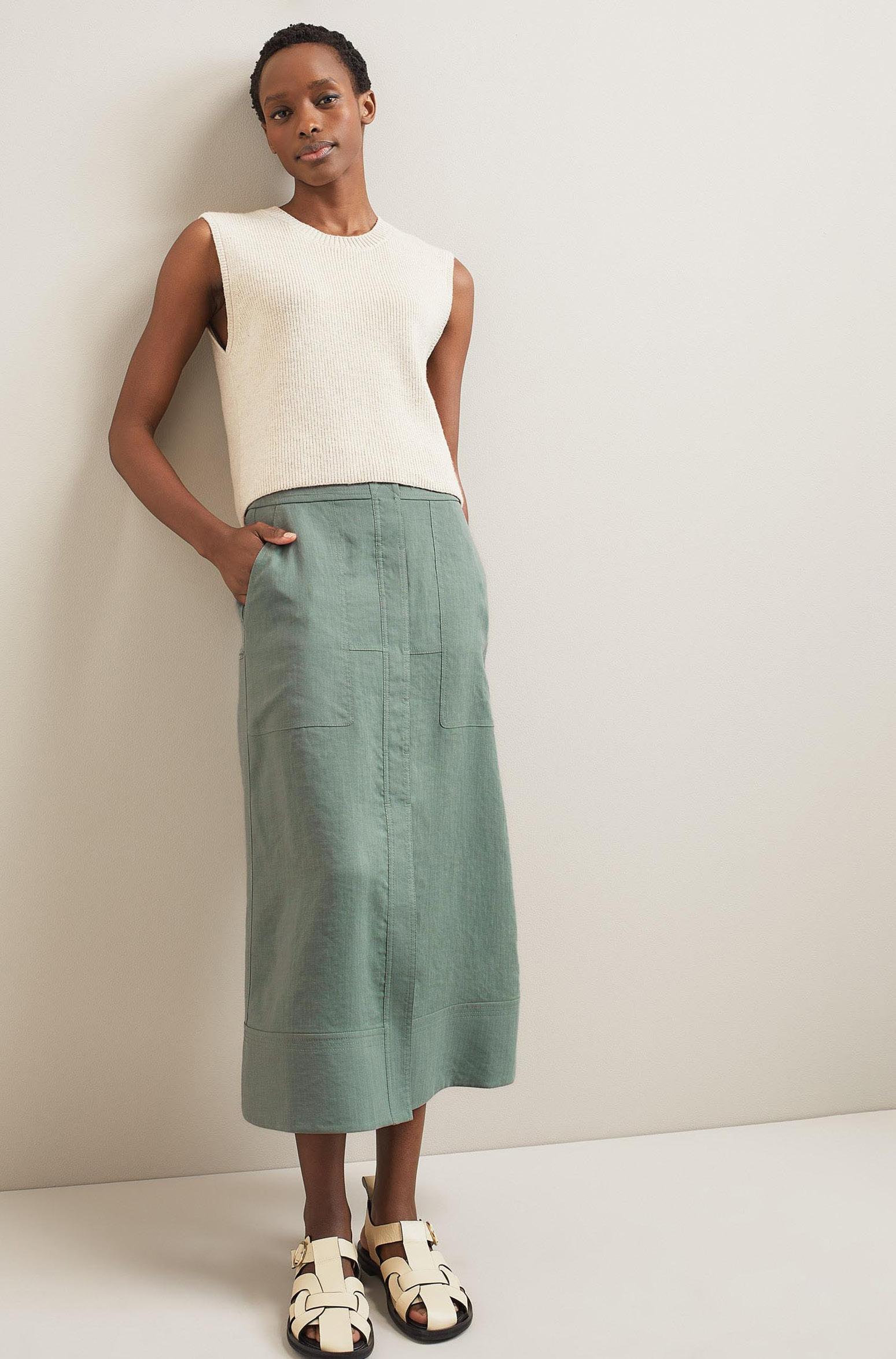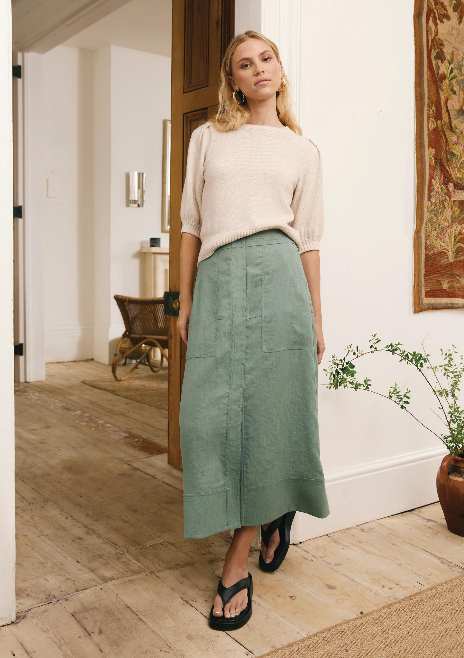 Safia Techni Linen Midi Skirt Sage Green. Also available in Navy and Cream. Machine washable. £270
