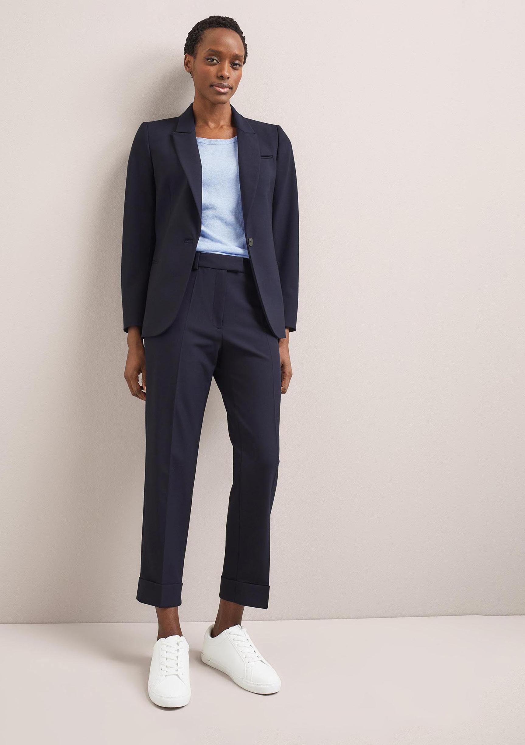 Clement Tailored Turn-Up Trouser in Stretch Wool Blend Black. Also available in Navy. £250
