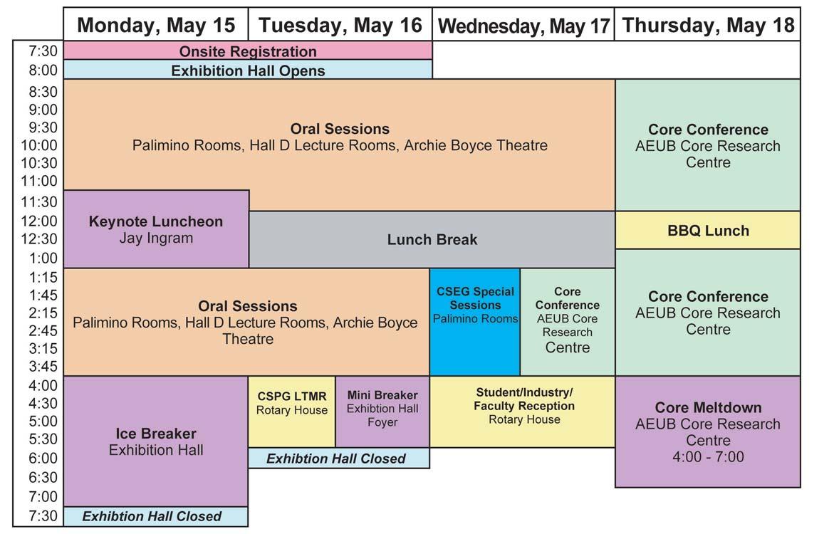 A full technical programme of oral and poster presentations is scheduled to begin on Monday,May 15th and wrap up at noon on Wednesday,May 17th.Special Sessions will be held on that Wednesday afternoon as well as the Core Conference beginning at the AEUB Core Research Centre.The Core Conference will continue on May 18th and the convention will wrap up that afternoon by the always anticipated Core Meltdown!