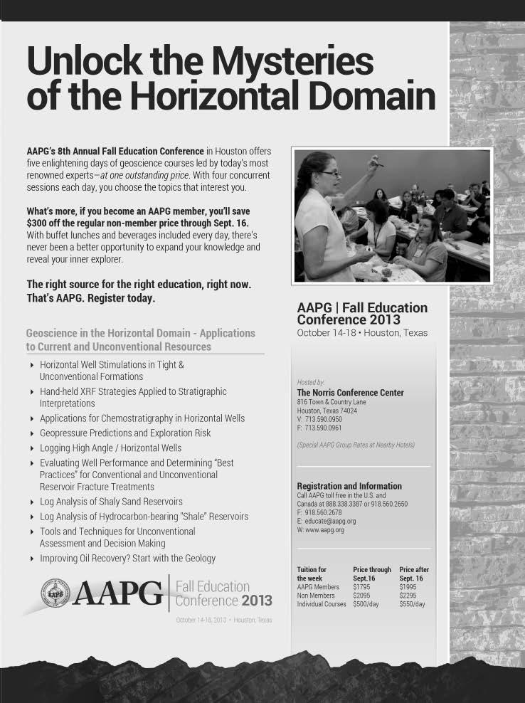 Last but not least we also have a program in place to reach out to the general public and that is our Honorary Address program. Every fall, this program brings one or two speakers involved in the earth sciences to speak with a general audience. Last year we brought in Dr. Trent Rehill who spoke about oil exploration in Africa and Dr. Ian Tattersall, an anthropologist from the American Museum of Natural History. Our goal is to grow the HA program into a larger evening program to further promote the CSPG but also the CSPG Education Trust Fund which is the main financial source for our student programs. We are taking the fall of 2013 off to re-tool this program to bring it back bigger and better for 2014. If you would like to get in on the ground floor (Continued on page 7...)