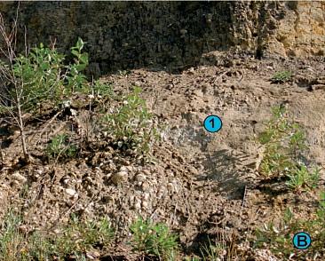 Alternatively (B), you can turn off the QEII at 67th street and immediately turn right at the Tim Horton’s restaurant. From the Tim Horton’s follow Orr Drive to a T-intersection at Oak Dr. Turn right at Oak Drive and follow until reaching a parking lot by a park. From there you can follow a paved path skirting the top of the cutbank turning off into a gravel path part way down in order to find a set of stairs leading down to the river path. This path allows direct access to the cutbank, however caution is advised as riprap has been placed on the cutbank to prevent erosion. This has the effect of both damaging the outcrop, and making footing quite treacherous. Nevertheless you can get some excellent closeup outcrop such as those below. This is a worthwhile trip for those interested in the glacial history of Alberta, its buried valley aquifers and Pleistocene palaeontology.
