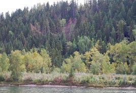 Below Left: View from P2 to ‘drunken forest’ located downstream of Wildwood slide. Since this photograph was taken in Sep 2010, this slide has advanced and exposes bedrock.