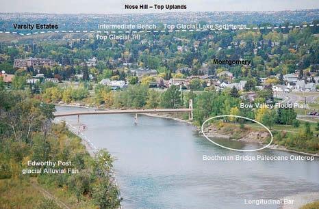 glacial episode between 25,000 and 13,000 years ago. The till is overlain by fine silts deposited in Glacial Lake Calgary which formed when melt waters from the Cordilleran Ice Sheet were blocked by the Laurentide Ice Sheet. The Laurentide Ice Sheet was centered on Hudson’s Bay. It is believed that the abrupt southward turn of the Bow River east of city centre is due to deflection of the Ice Age Bow River by a wall of ice marking the western limit of the Laurentide Ice Sheet. The boundary between the continental scale Cordilleran and Laurentide ice sheets is approximately marked by the Foothills Erratics Train. Meter-scale blocks of quartzite, sourced from the Cambrian Gog Group in the Jasper area, are found on Nose Hill and elsewhere in Calgary.