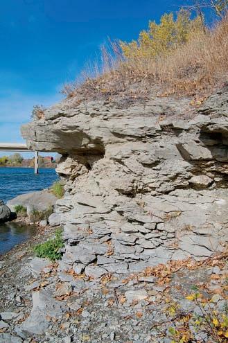 Bedrock of the Upper Scollard formation is located about 100 m downstream of the Boothman Bridge and comprises fluvial channels and mudstones deposited about 1.5 Ma after the K-T extinction event (ca. 64 Ma, magnetochron 28 r). This exposure is correlative to the Lower Porcupine Hills Fm of southern Alberta. It is stratigraphically above the Willow Creek Fm and below the Paskapoo Formation which is exposed at Canada Olympic Park. The strata consist of cross-bedded channel sandstones and interchannel siltstones and mudstones. The channels contain clay rip-up clasts and numerous well preserved fresh water bivalves.