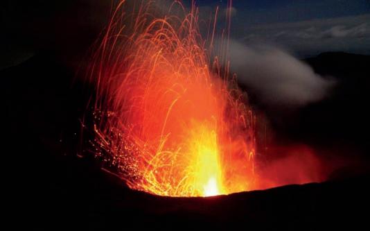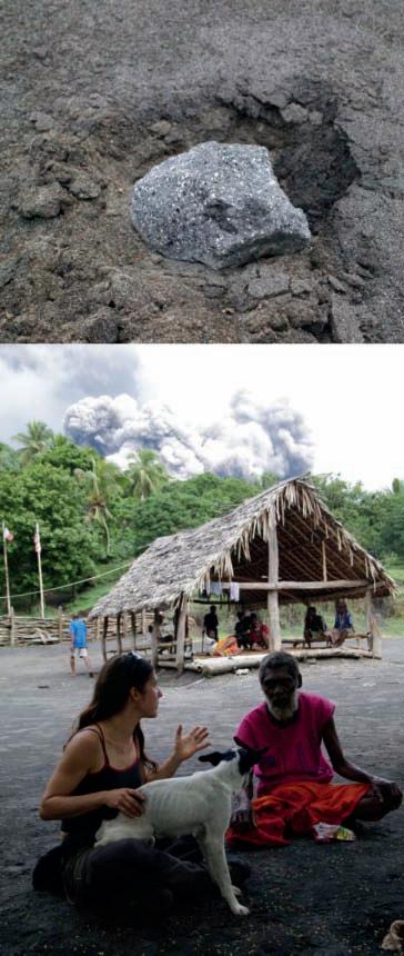 BL: At Lenakel Village, with Yasur erupting in the background. BR: Incandescent bombs reach 1km in height during a particularly active phase of the eruption. The blobs of semi-molten rock leave streaks on the slope as they roll back to the vent.