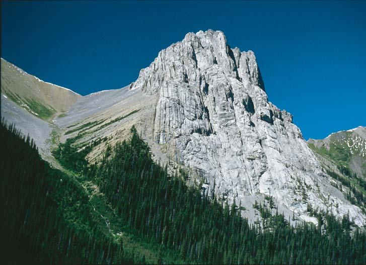 Peter Lougheed Provincial Park, Alberta. View looking north to Commonwealth Peak. Commonwealth Peak is formed by the steeply dipping, resistant, gray carbonates of the Upper Devonian Lower Palliser Formation that forms part of the east limb of an anticline. The brownish and more recessive arenaceous beds of the older Sassenach Formation lie below and to the west of the Palliser. Photo by Gordon Hurlburt.