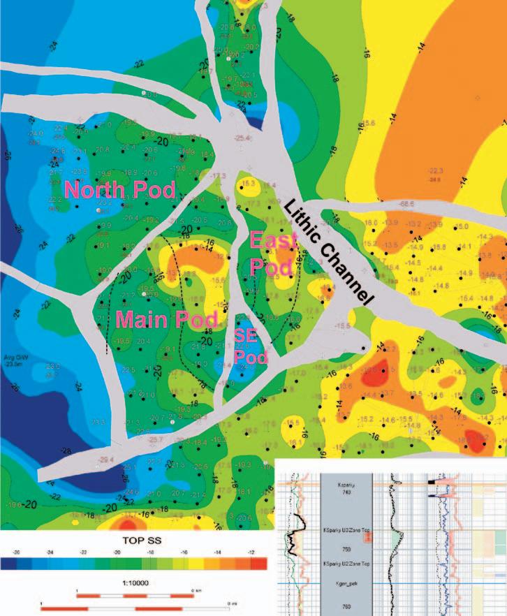 Core analyses confirm the complex nature of the Upper Mannville (Sparky) sands.Cored wells encountered embayment deposits,lithic coarse-grained channel deposits with calcite cement filling the pore spaces,and a middle shoreface environment containing fine-grained sands with crossbedding and hummocky stratification.In addition,the Upper Mannville Marker to the Sparky isopach and the Sparky vertical thickness maps indicate the existence of additional lithic channels not obvious on seismic.A subtle seismic low is seen by well 04/12-30,which is located in a seismic thin.The correlation was the basis for inferring the presence of lithic channels without the necessity of well control.