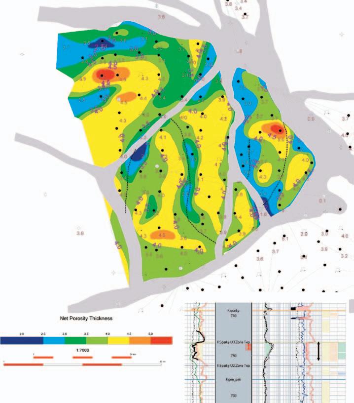 log values while wells with much “better” log characteristics have lower cumulative production.However,well 104/04-30 is flanked by two injection wells and experienced several years of very low GOR with elevated oil production rates,due to waterflood support. This ‘low GOR’ period,accounts for most of the oil produced from well 104/04-30.A subsequent increase in GOR coincides with the inception of a free gas phase in the reservoir and a corresponding drop in oil productivity.