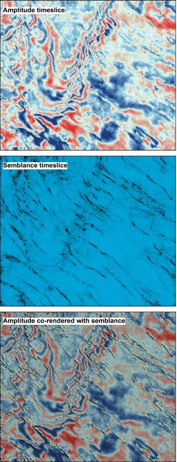 Figure 7. Timeslices through a 3-D seismic volume from the Western Desert of Egypt. Faults are visible in the amplitude timeslice (top) as reflection offsets and truncations that trend from upper left to lower right. The faults are much easier to identify in the semblance (“coherency”) timeslice (middle) from the same level. Blue areas represent continuous reflections and black areas indicate changes in reflection continuity (e.g., faults). The image at bottom shows semblance and amplitude displayed together (“co-rendered”). This display is most useful for interpreting/mapping faults. Data courtesy of Apache (Cairo).