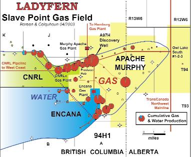 Ongoing development drilling programs have continued in the Ladyfern field through 2003 and significant reserve additions are still being made,if at a somewhat diminished pace.The Ladyfern Slave Point gas field has produced 340 bcf to date and published recoverable
