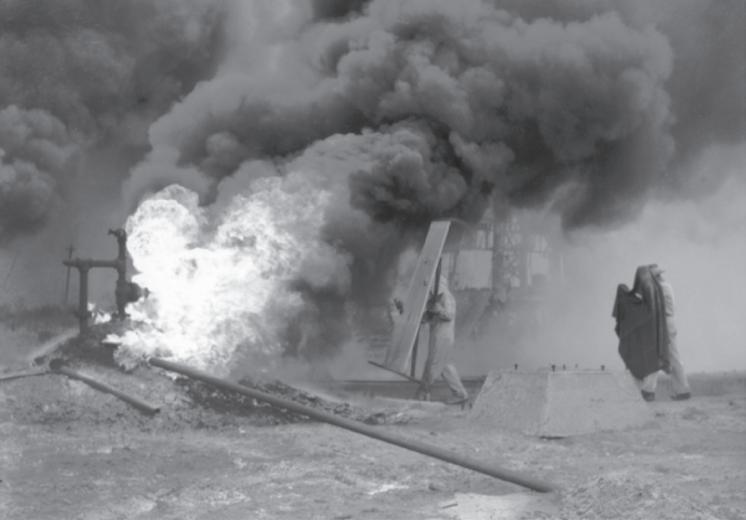 Figure 1: Staff Sergeant M.C. Butler, of the Royal Australian Engineers works to extinguish an oil well fire in Borneo on July 1, 1945. Here he is shown wearing a fire-resistant asbestos suit and holding a shield to allow him to get close enough to the blaze. Image courtesy of the Australian War Memorial.