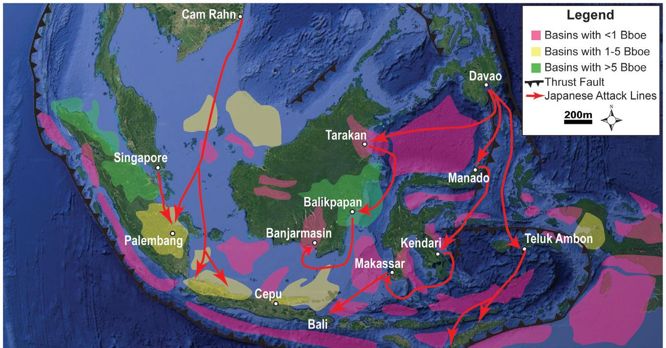 These tectonostratigraphic conditions created many extensional and transtensional rift basins, post-rift sag basins, pull-apart basins, fault-tip basins, and fault parallel basins (Pubellier and Morley 2014). As a result, hydrocarbons are abundant throughout the area. The slight variations in geologic history created sufficiently differing geologic settings between Japan and SE Asia to have lasting impacts on geopolitics, culture, and in this case, war.