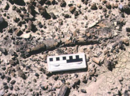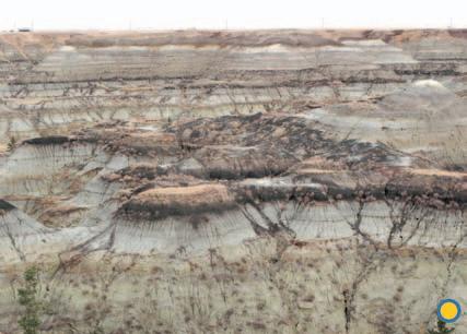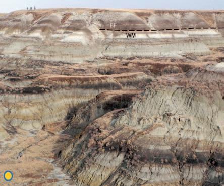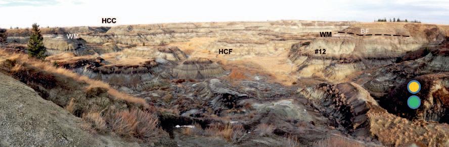 Deeper into the Canyon to the north, one moves gradually lower in stratigraphic section. The noncoaly, green-grey Tolman Member that dominates these patchy exposures is rich in dinosaur bone fragments and represents a time of broad climatic cooling in southern Alberta. Farther down section, near the mouth of the Canyon at Kneehills Creek, exposures of the Drumheller Marine Tongue are plentiful and are dominated by storm generated coquinas of oysters and other marine pelecypods. With an age of ~ 70.6 Ma, the Drumheller Marine Tongue represents the last significant marine transgression in Western Canada and hosts the Campanian-Maastrichtian boundary.