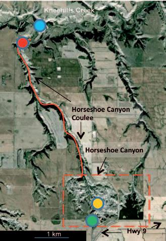 Physiography and hiking: Horseshoe Canyon is mostly known as a section-scale (1 mi2; 2.5 km2) patch of badlands (dashed red box) adjacent to Highway 9, west of Drumheller. However the Canyon also includes a 6 km long, narrow and steep-sided coulee (HCC, red line) that drains into Kneehills Creek to the north. Maximum vertical relief in Horseshoe Canyon is 80 m. There are numerous tracks and game trails throughout the Canyon, but the open, three-dimensional nature of the badlands near the parking lot (green dot) allows hikers to explore the landscape in any direction they please. The landscape and distribution of modern plants and animals varies throughout the Canyon, reflecting profound year-round differences in runoff, erosion, sun/shade, wind, air temperature, and snow coverage.
