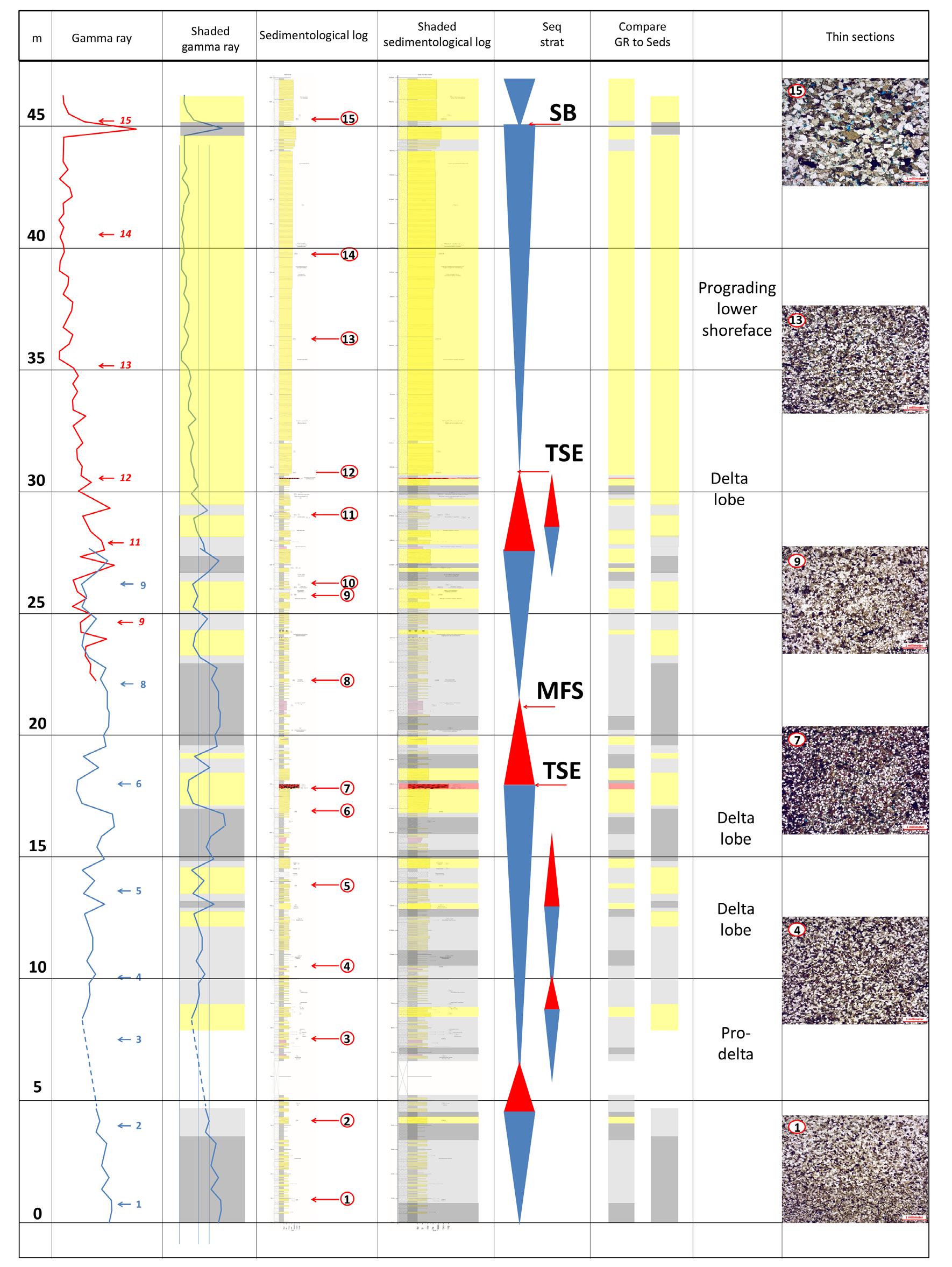 (6) comparison of sed log and interpreted GR log; (7) depositional interpretation; (8) selected thin sections.