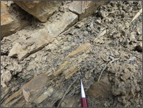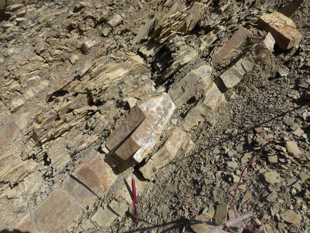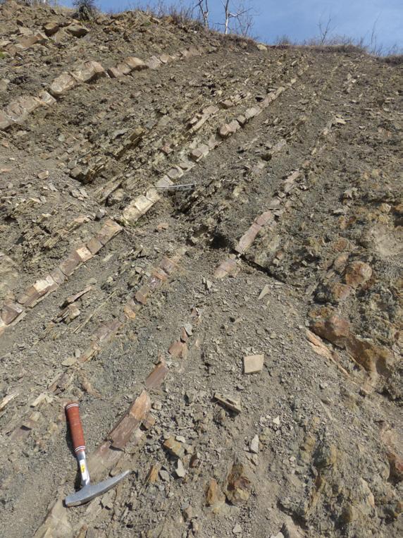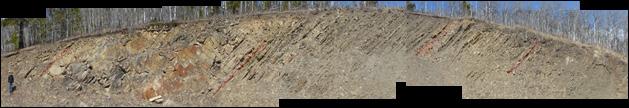 The studied section (Figure 6), informally named “the Black Sheep”, is located on Highway 546 approximately 15 km to the west of Diamond Valley. Around 47 m of section is relatively well exposed on a rugged south facing slope. The steep tectonic dips can be attributed to the location of the Black Sheep outcrop on the western flank of the Triangle Zone (a structural feature related to the mountain building that created the Rockies). The photographs below (Photos A to T) can be located on the logged section using the measured depths (Figure 7). A sedimentological section was logged at a centimetre scale through the exposed stratigraphy, and a handheld gamma ray log was measured using a scintillometer in association with the University of Calgary. Rock samples were collected from 15 of the sandstone beds and thin sections were made to examine the porosity and cementation of these beds.